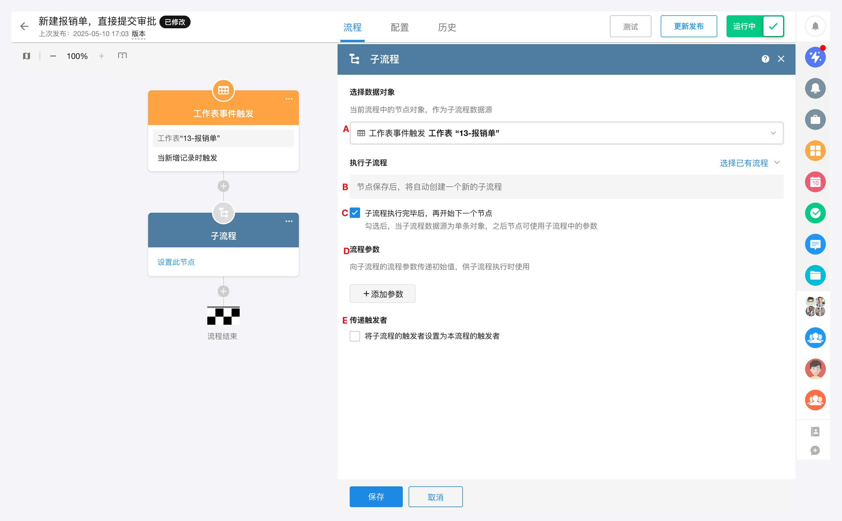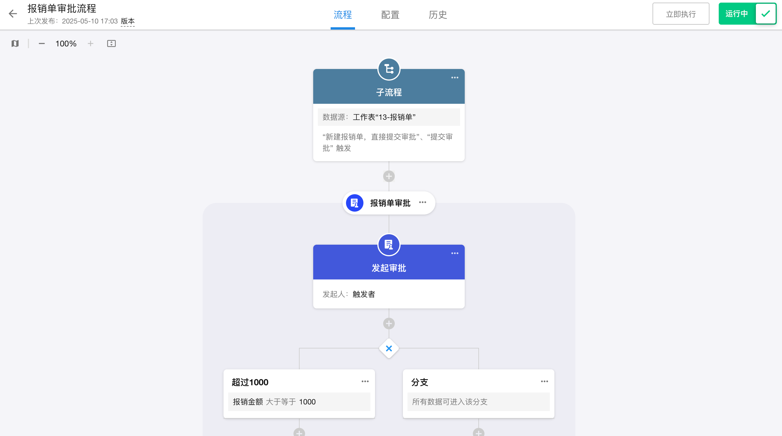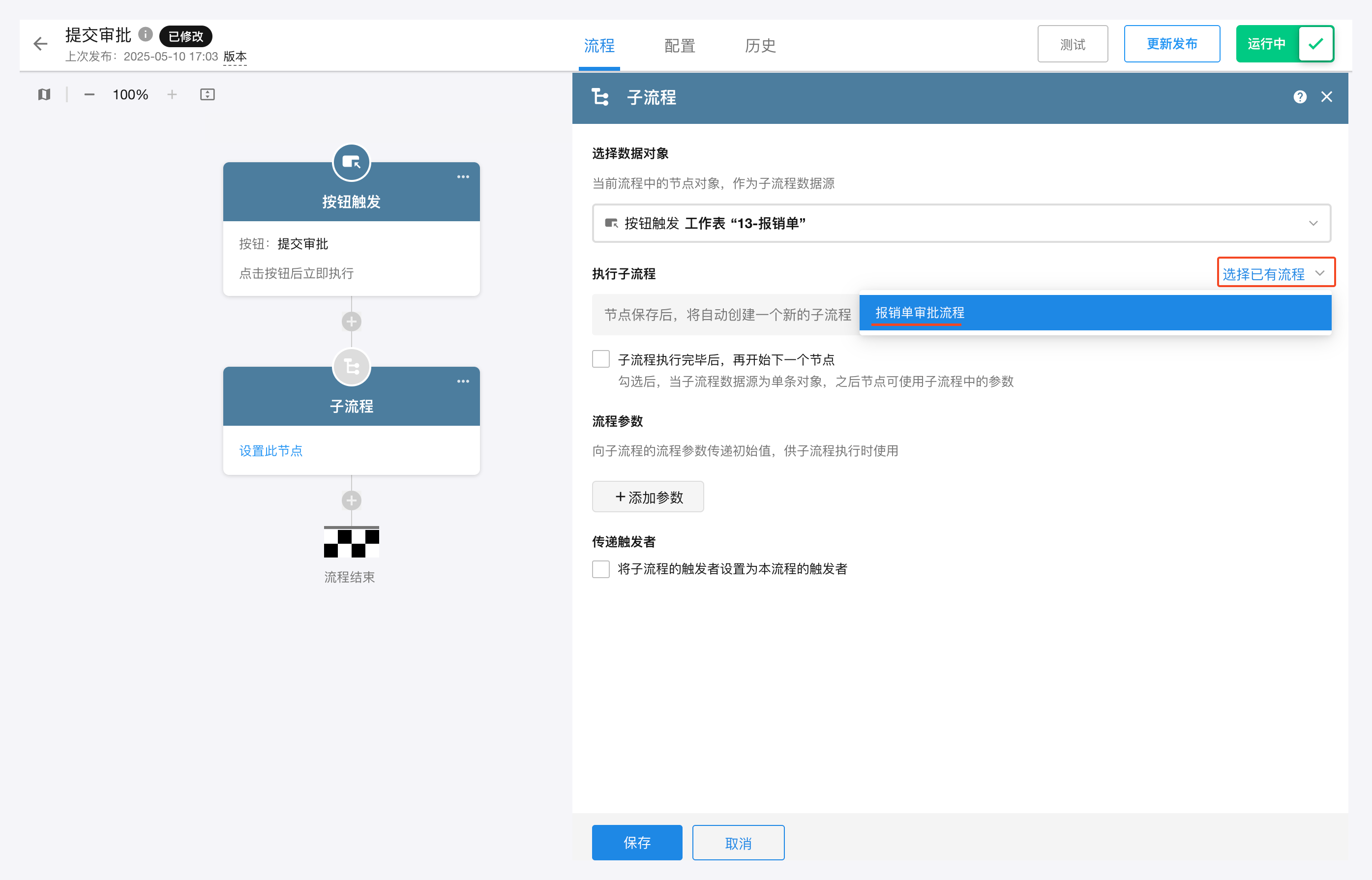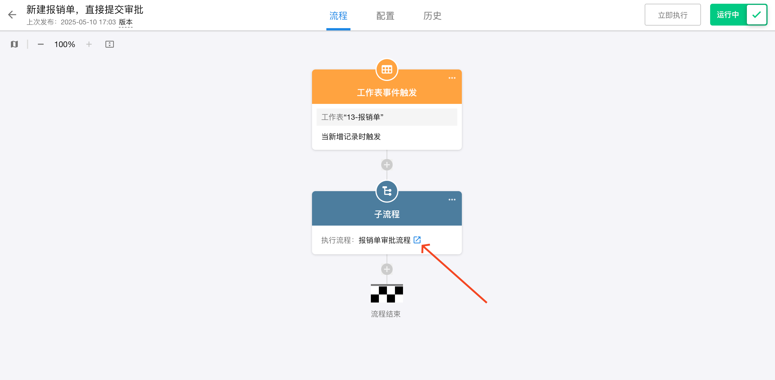 例如,一个报销审批流程,新增记录时触发审批流,也可以先保存为草稿,后面再点击按钮触发审批流程。虽然触发方式不同,但是审批流程相同的,因此可以将开始审批的流程作为子流程,当作通用流程,无论是新增记录还是点击按钮触发,都可以直接调用子流程,开始审批。