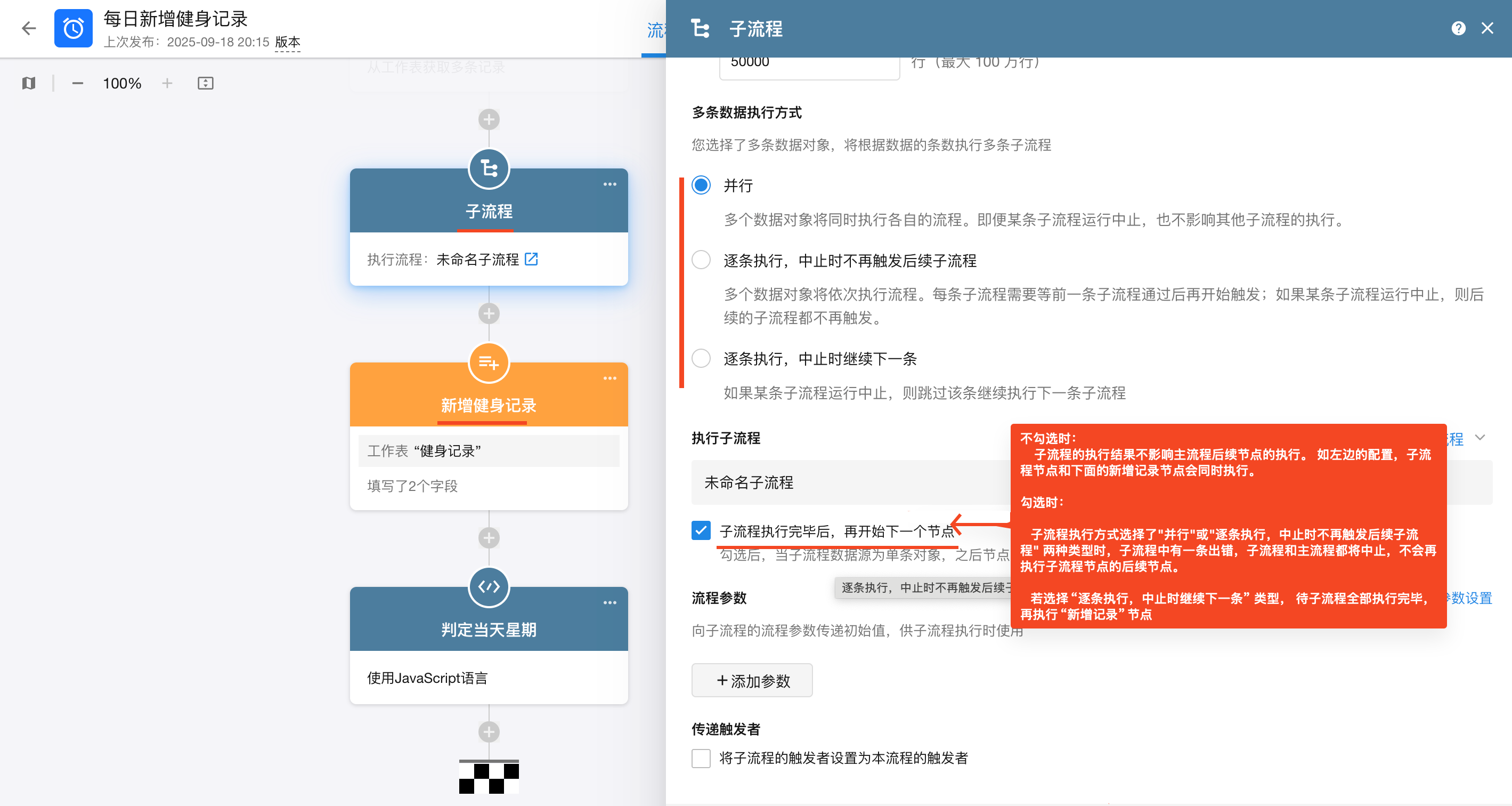 当流程中需要处理的批量数据太多(超过100条),则可以通过子流程处理,子流程可批量处理的工作表数据量为100万行以内。