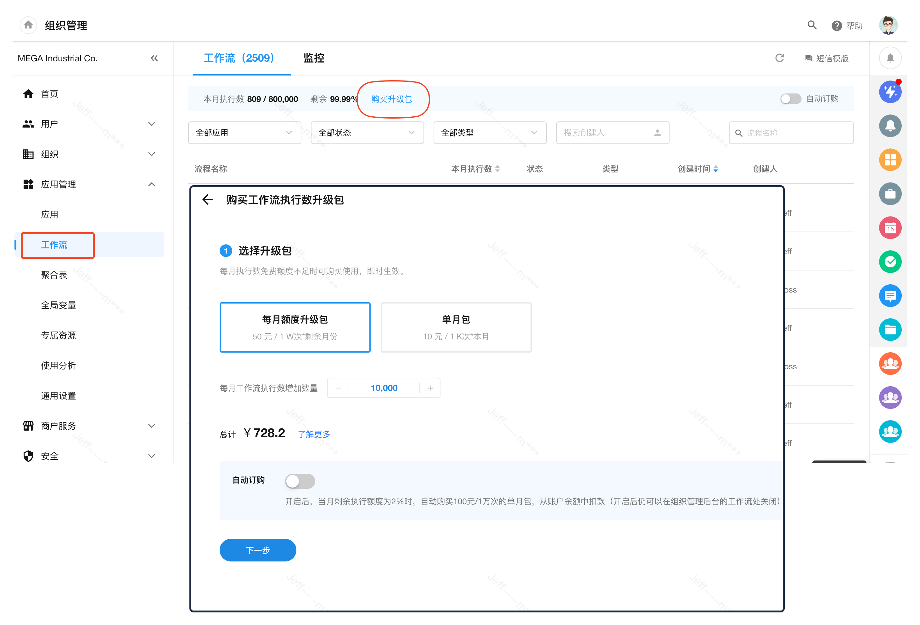 如果每月需要更多的执行次数,除了升级更高版本外,还可以单独购买工作流执行数升级包,当月即可增加。