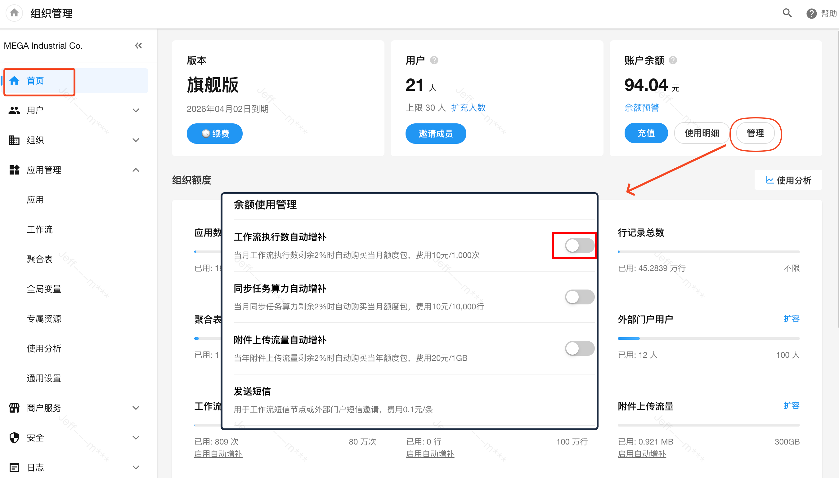 关闭自动订购:组织管理员进入管理后台首页 > 账户余额,点击“管理”按钮可管理自定义订购的项目。