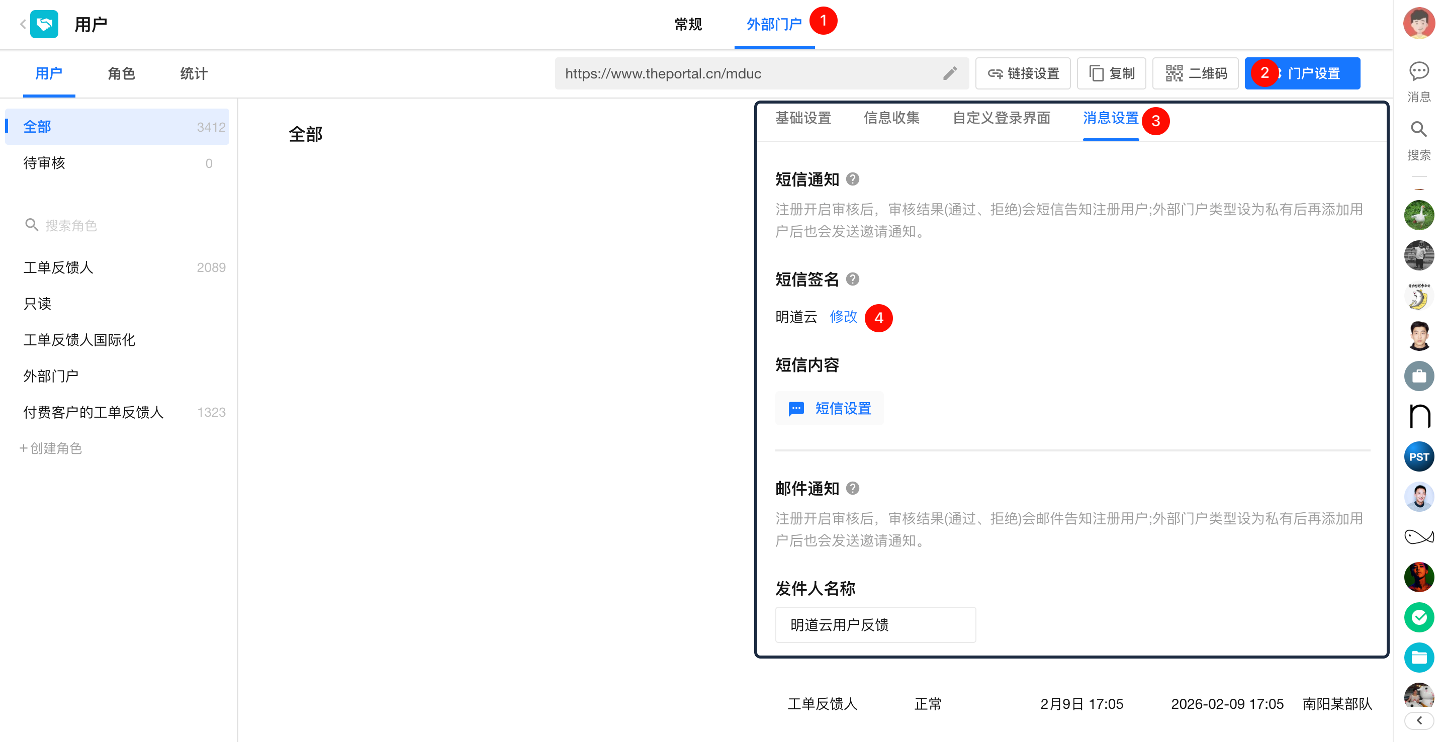 外部门户短信签名设置路径:应用管理员通过【外部门户】>【门户设置】>【消息设置】,查看和选择签名。