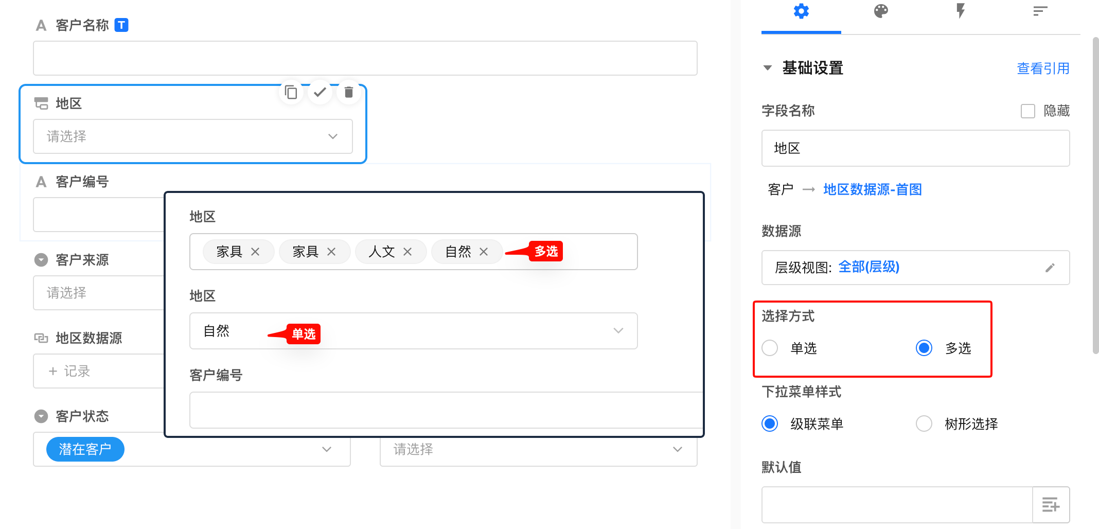 支持单选和多选,保存后可以切换选择方式。