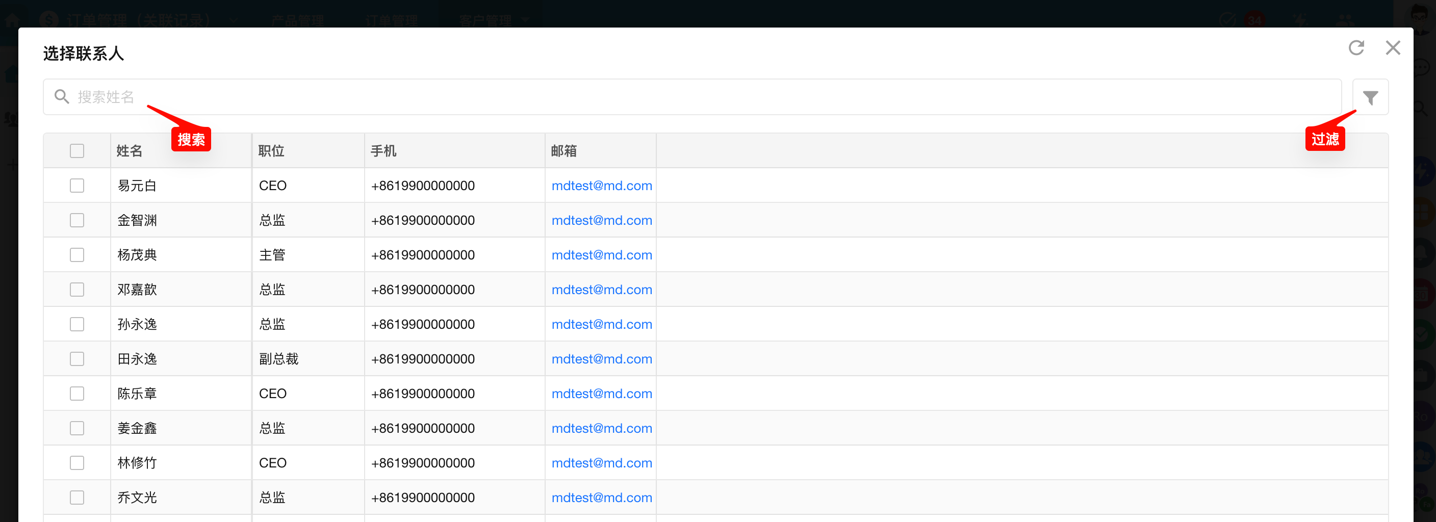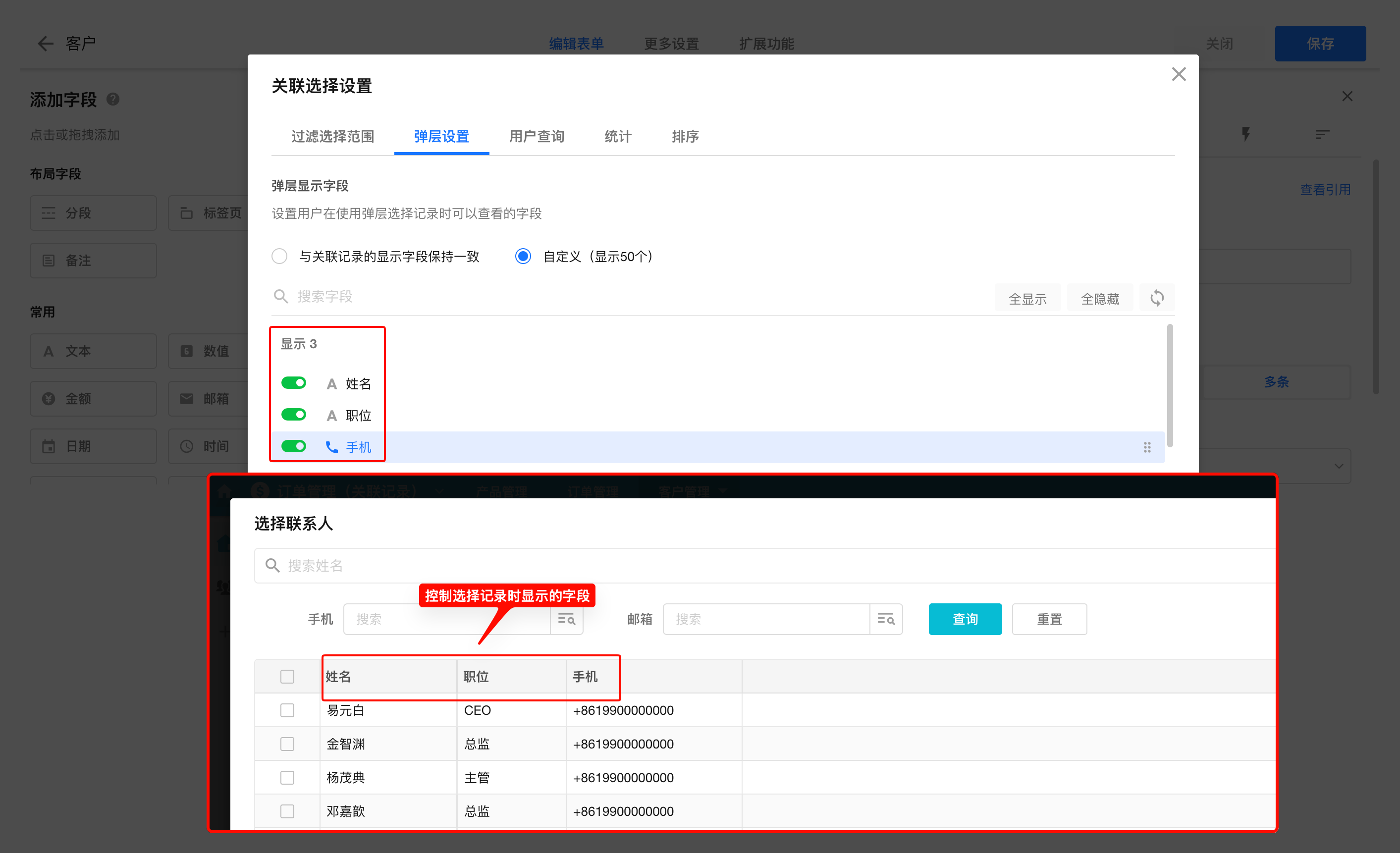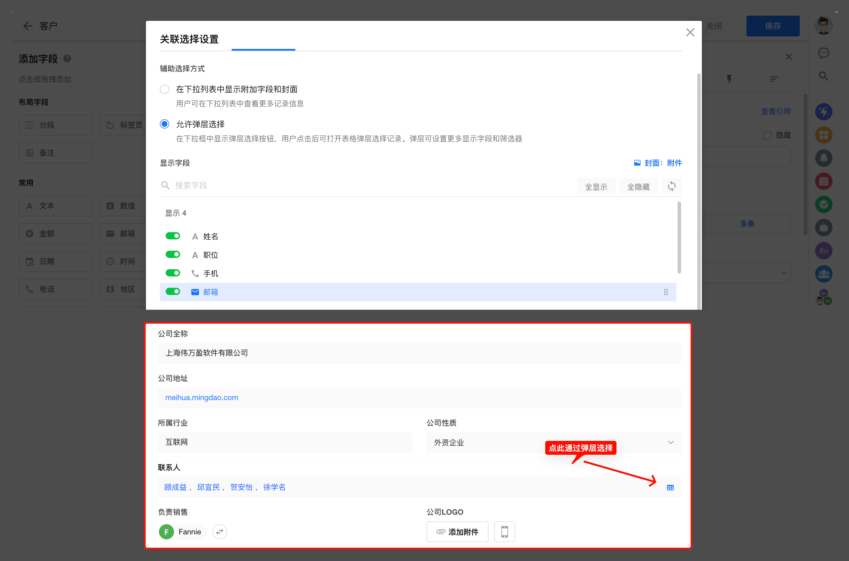 关联样式为卡片、表格形式式,通过弹层方式选择关联记录。 可以配置弹层中显示的字段和顺序。