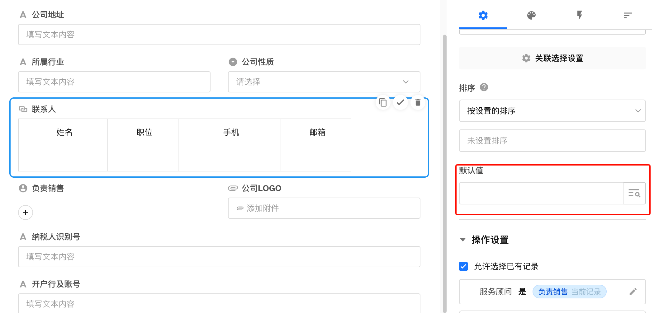 新建记录时,可以默认关联1条或多条记录,支持三种方式: