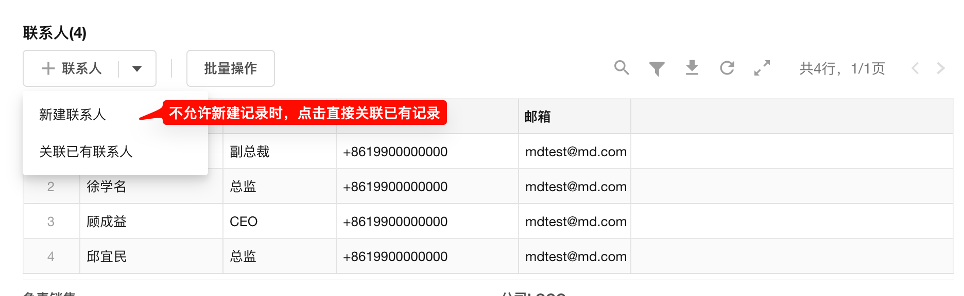 单条: 最多只关联 1 条(例:一个联系人只能所属一个客户公司)。