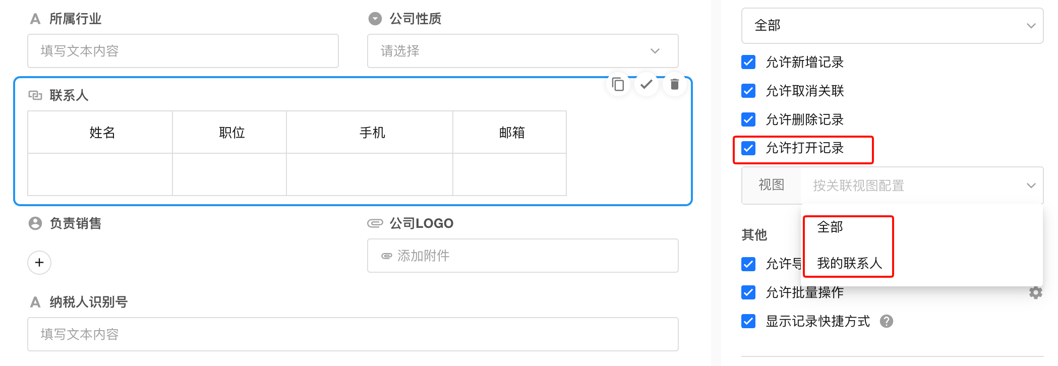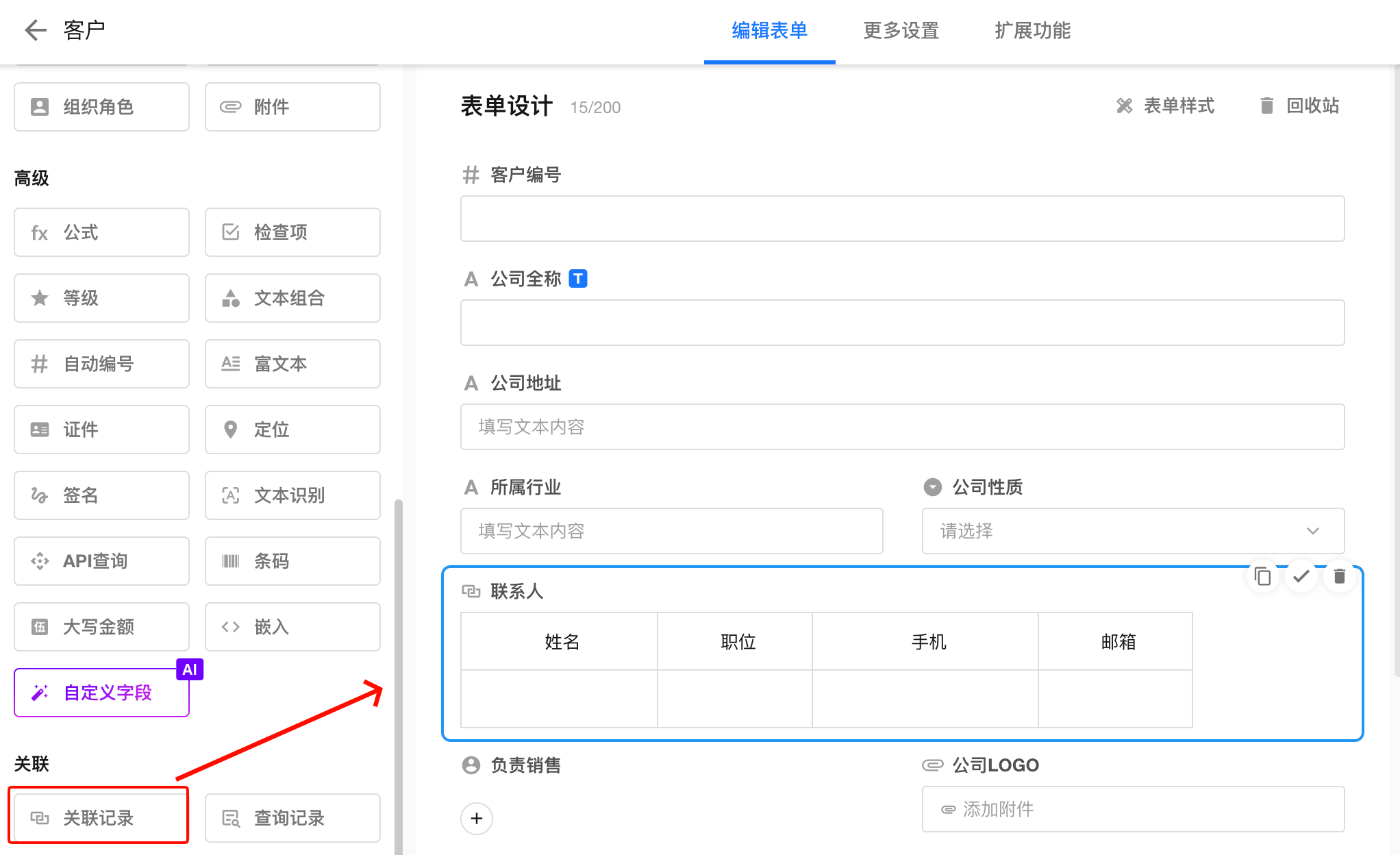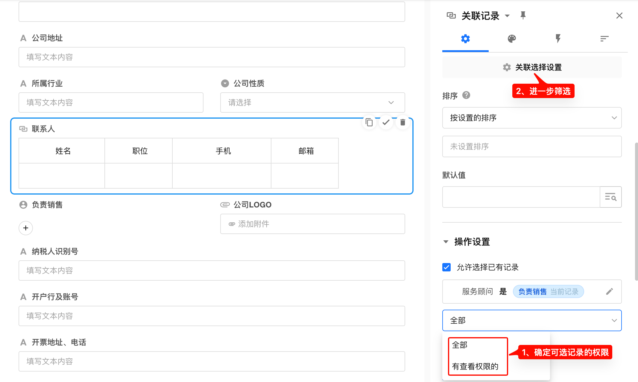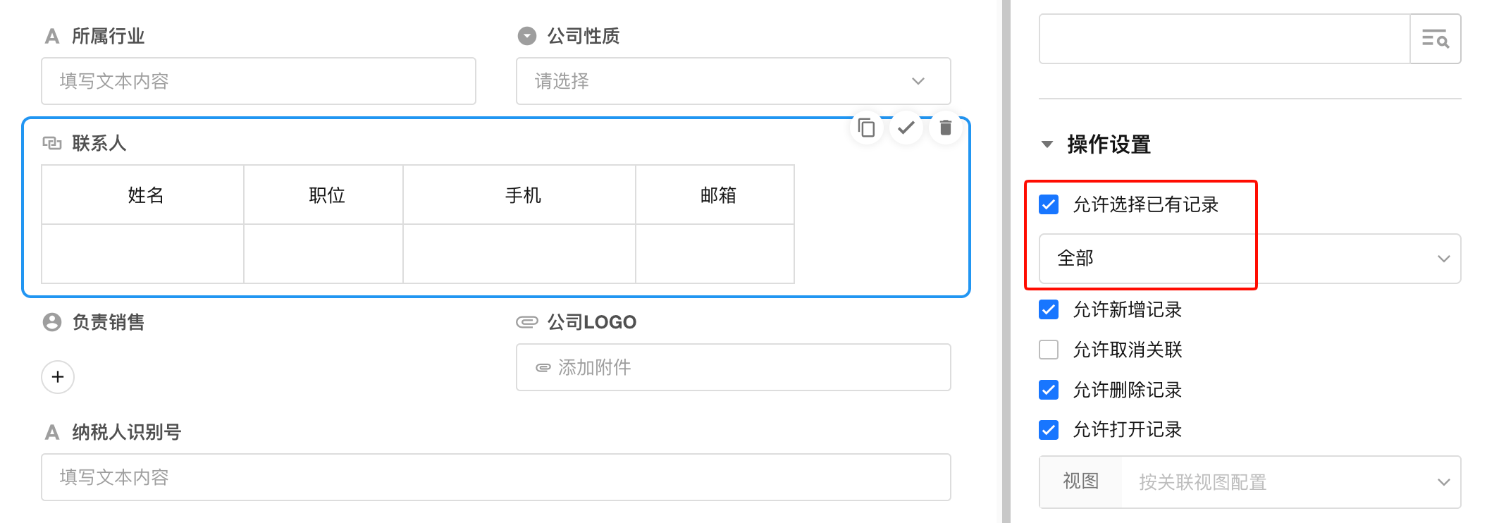 建立关系后,系统赋予“客户记录可关联联系人记录”的能力;