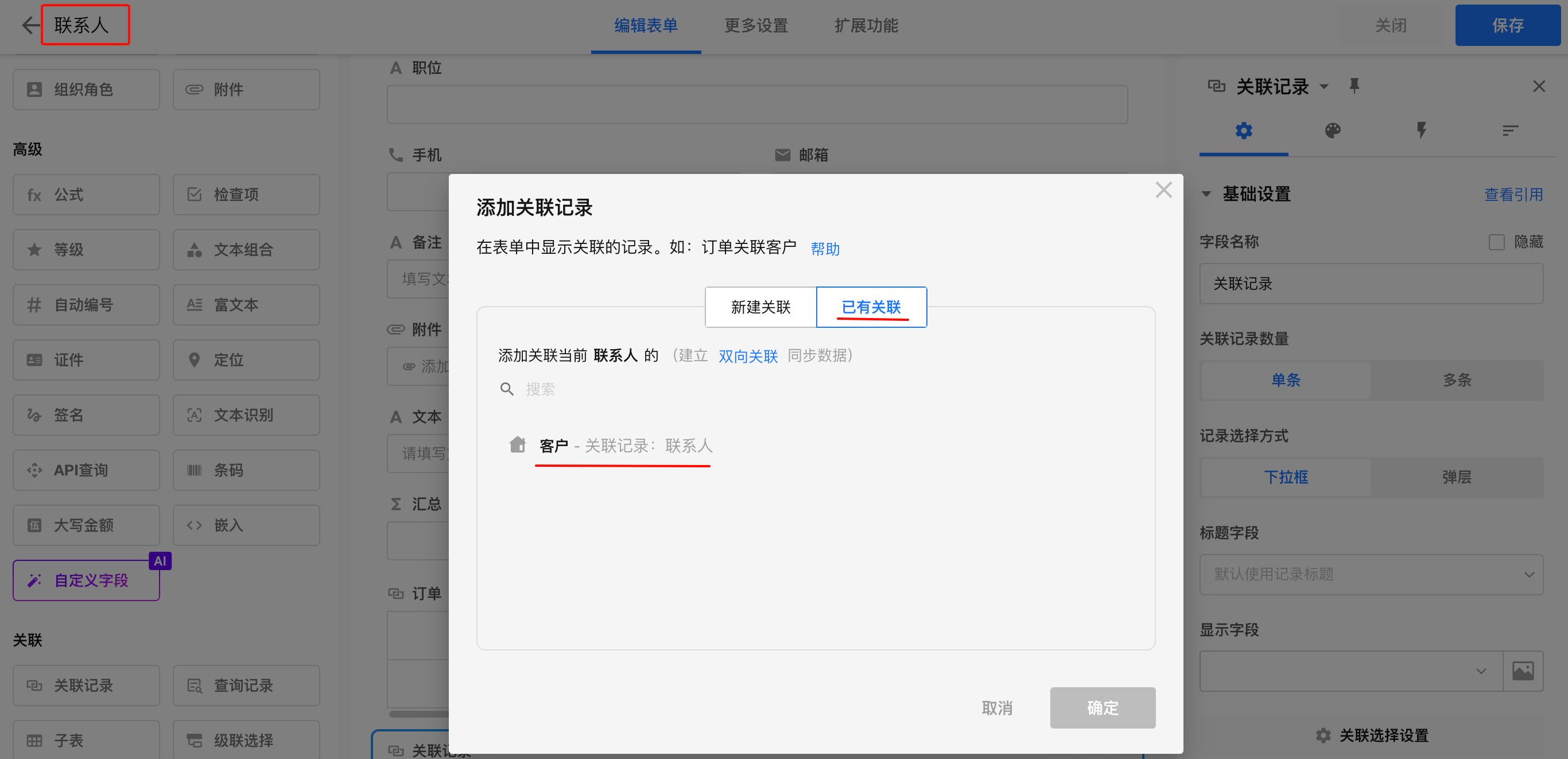 若对方表已存在关联字段,再配置时可从“已有关联”中直接选择。例如客户表 已经关联了联系表,在联系人表中关联客户时,可直接选择 已有关联。