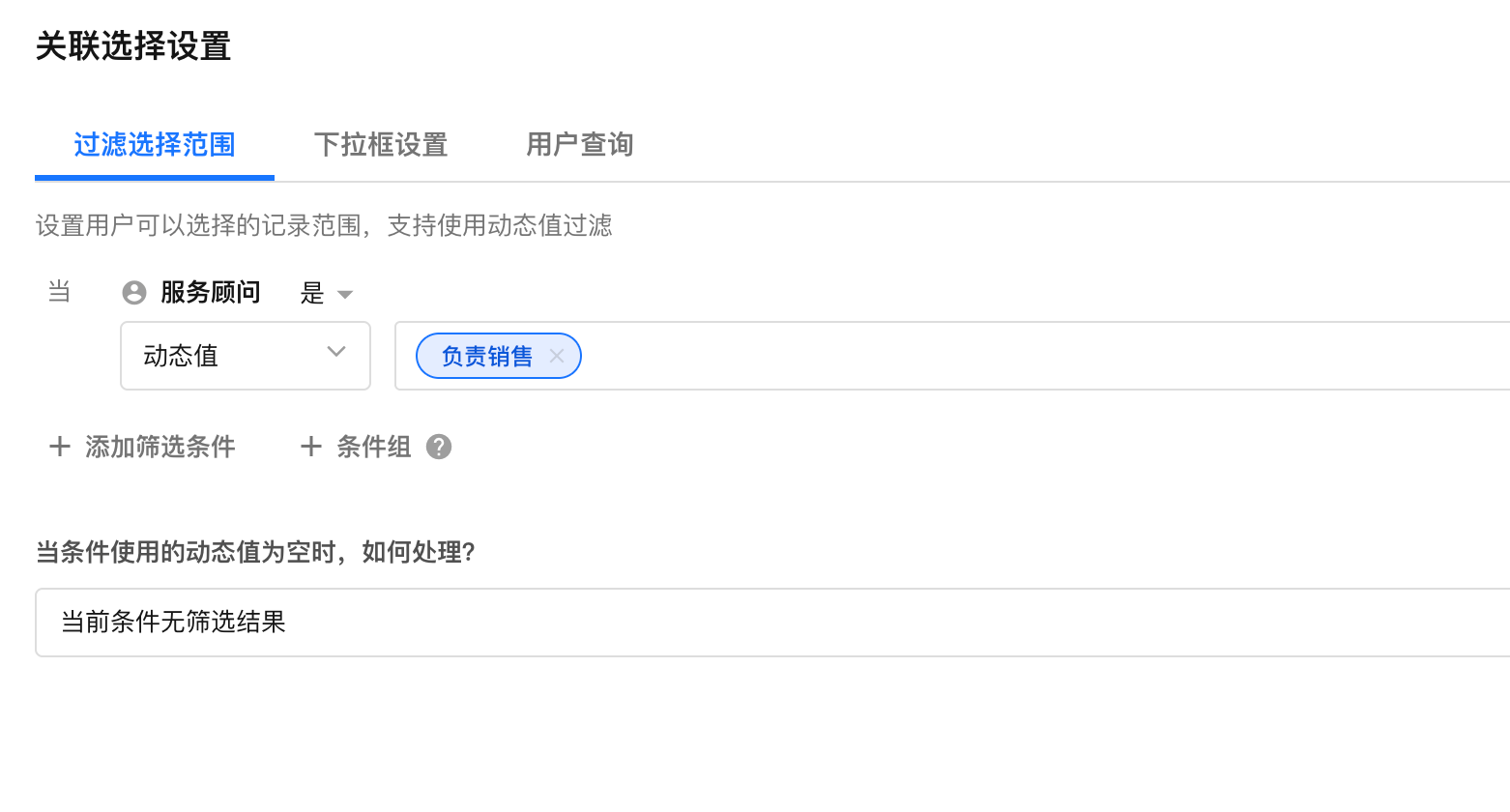 通过添加筛选条件,缩小可选择记录范围。