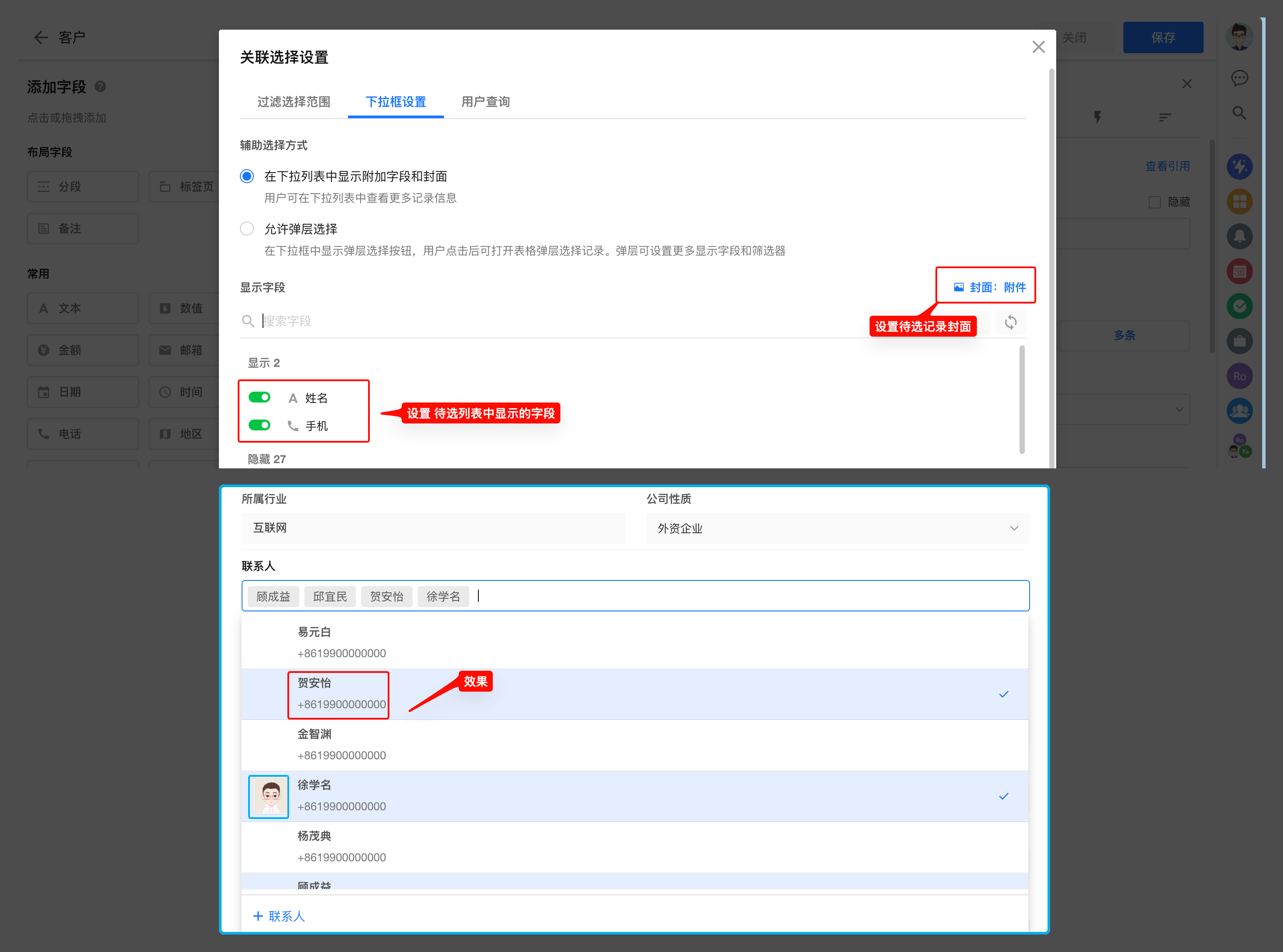 下拉列表附加信息: 如果需要在选择记录时下拉菜单中显示更多字段,可以勾选“在下拉列表中显示附加信息和封面”,并设置显示的字段。