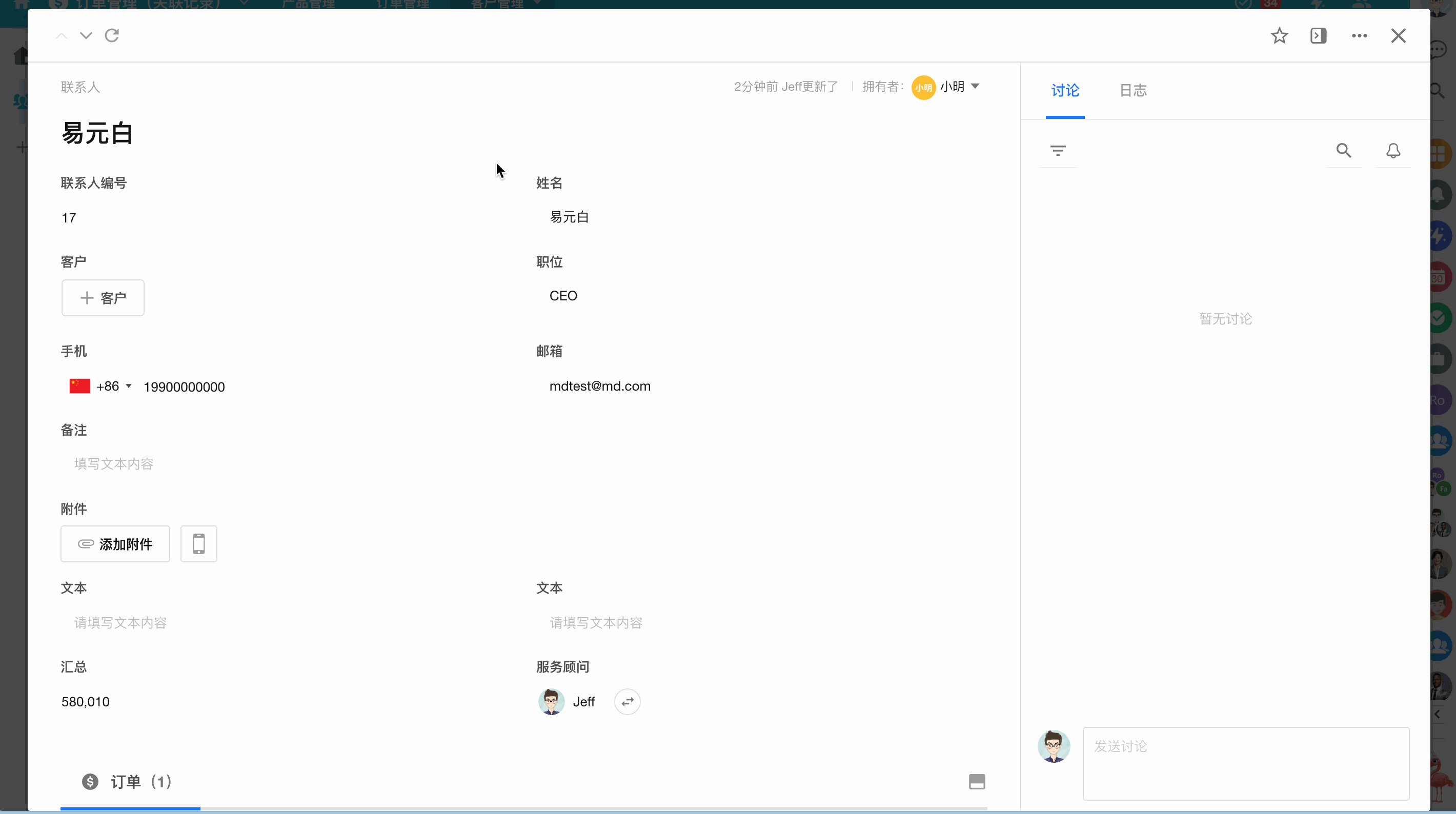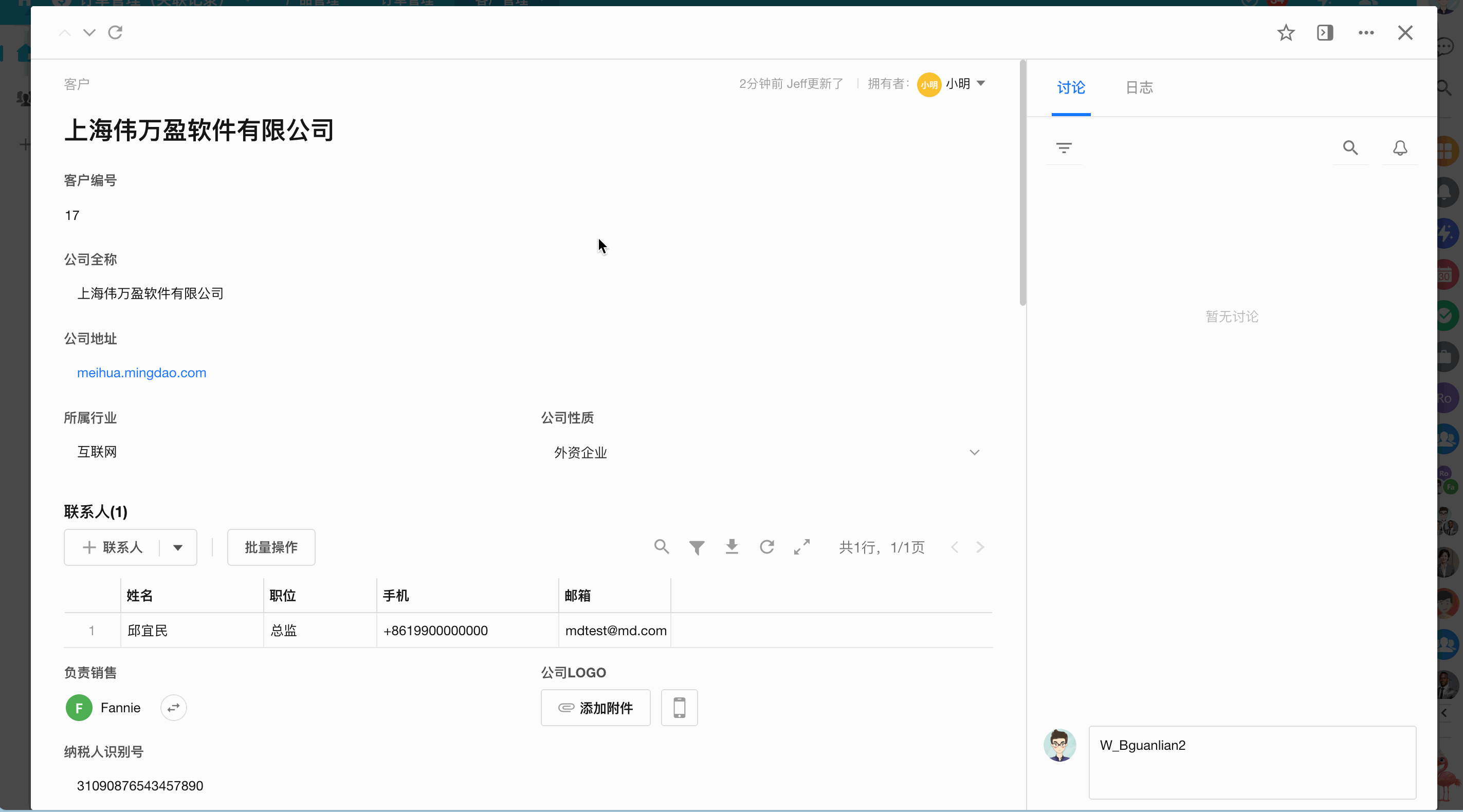以客户和联系人两表为例,两表通过“关联记录”字段可以互相关联并同步,这种关联关系为双向关联,在客户表记录关联一个联系人记录后,在联系人记录也会自动显示关联了此客户,效果如下图: