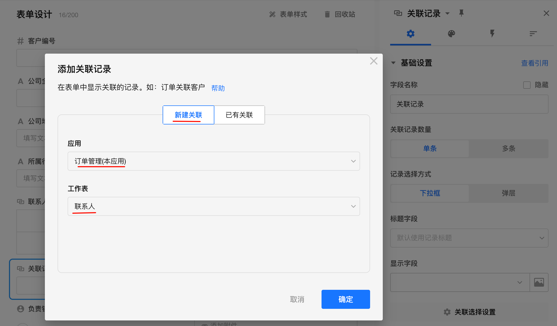 快速配置(场景示例:客户表关联联系人表)