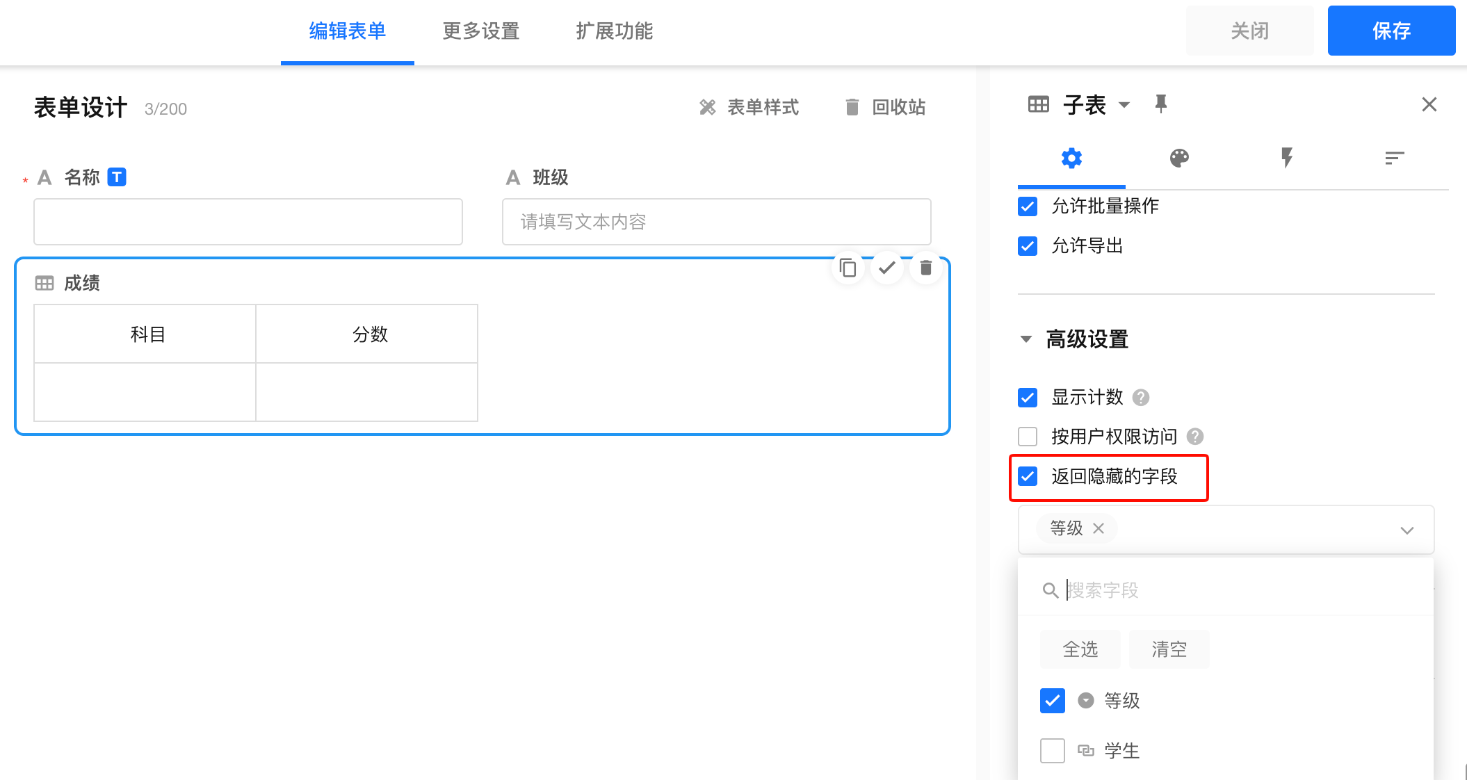 仅实体子表支持【返回隐藏的字段】的配置