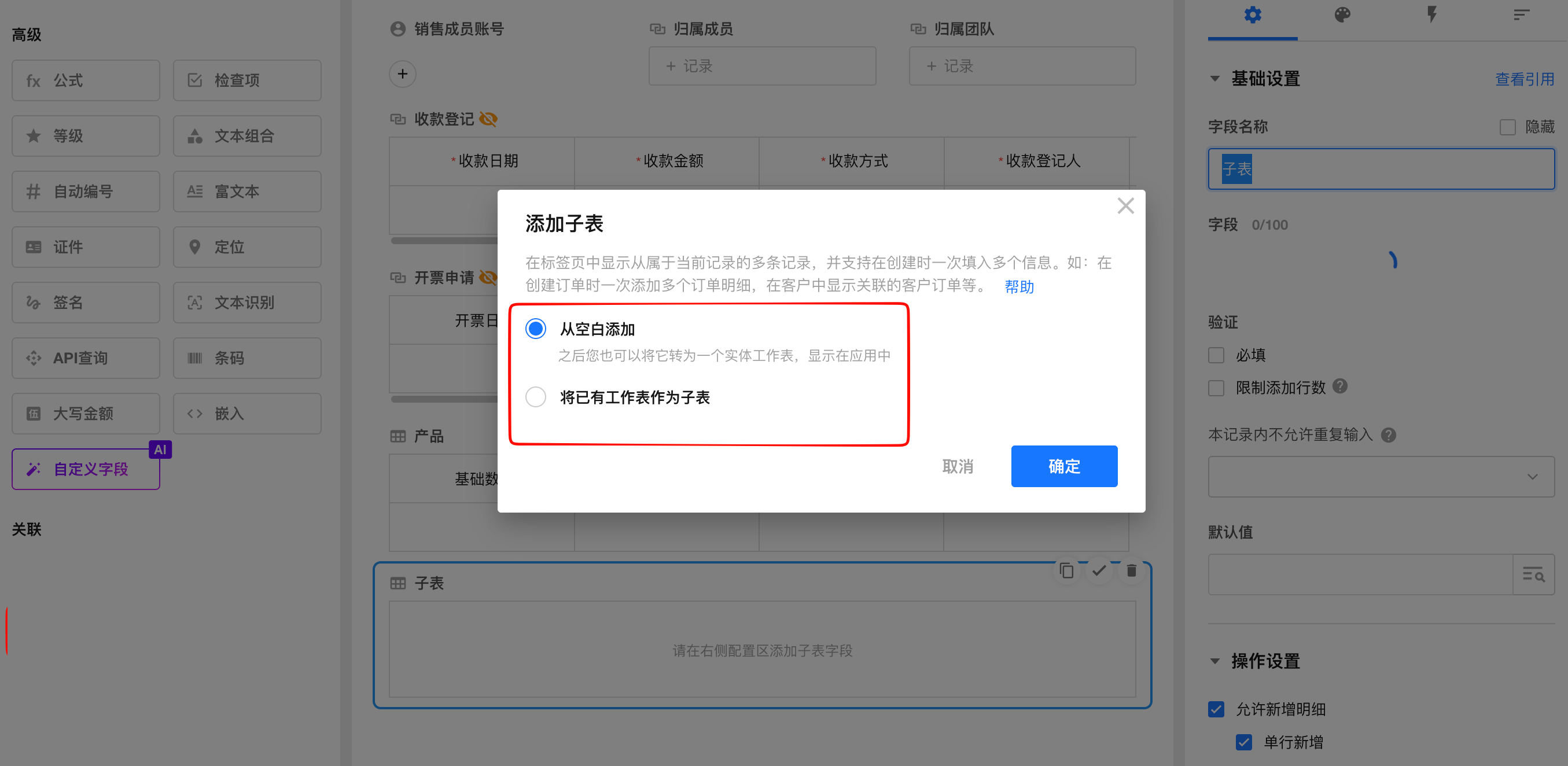 从空白添加: 直接创建一个新的子表,并设计子表的结构。这个子表是虚拟表或隐藏表,不会显示在工作表导航中,只能通过主表(例如订单表就是主表)查看和添加。