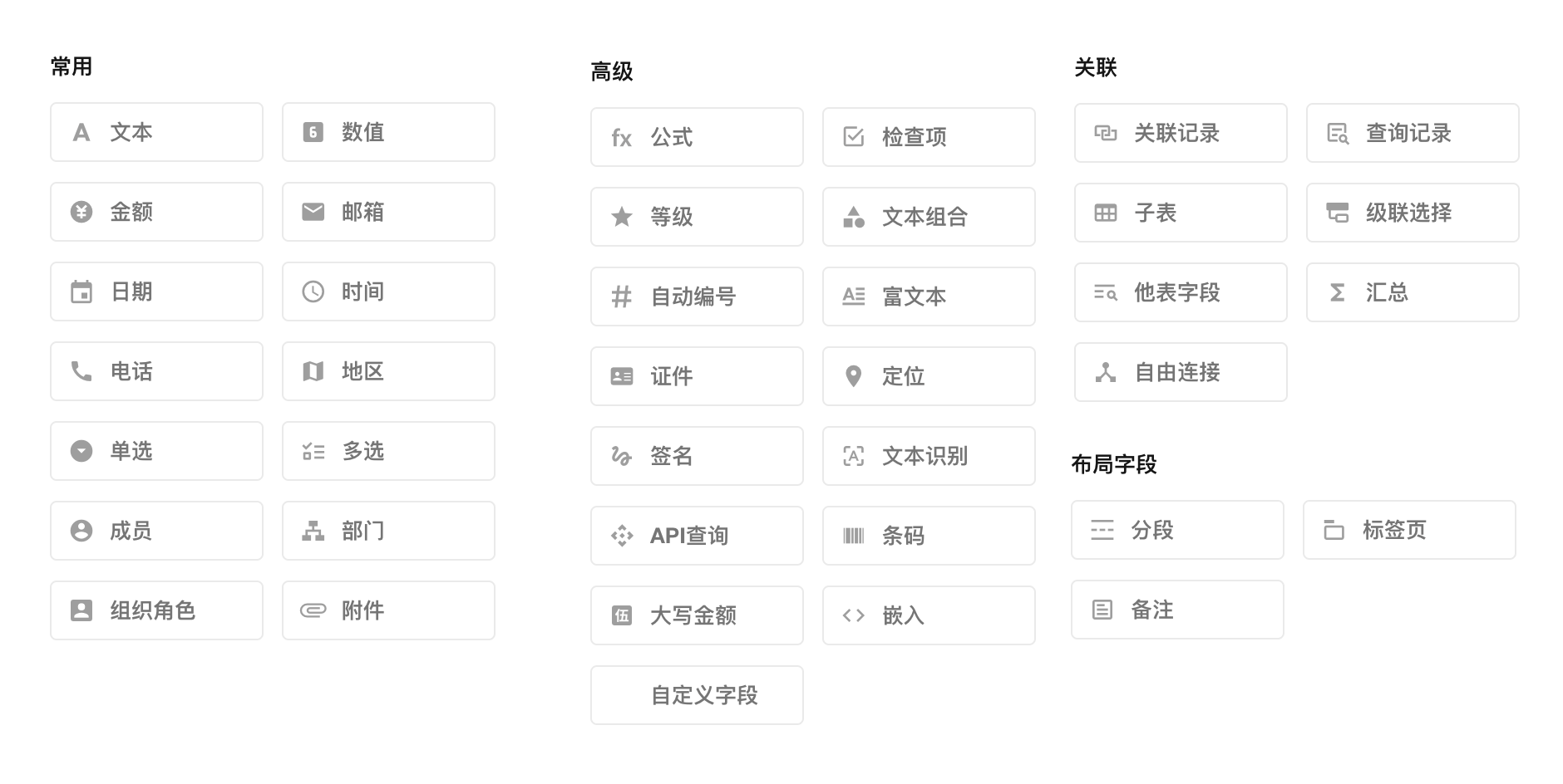 字段和控件: 为了字段数据的规范和正确 的输入,预先设置了一些格式化的字段类型,即控件。例如,日期控件、邮箱控件、金额控件等等。 添加字段时,需要先根据此字段的数据类型选择合适的控件。