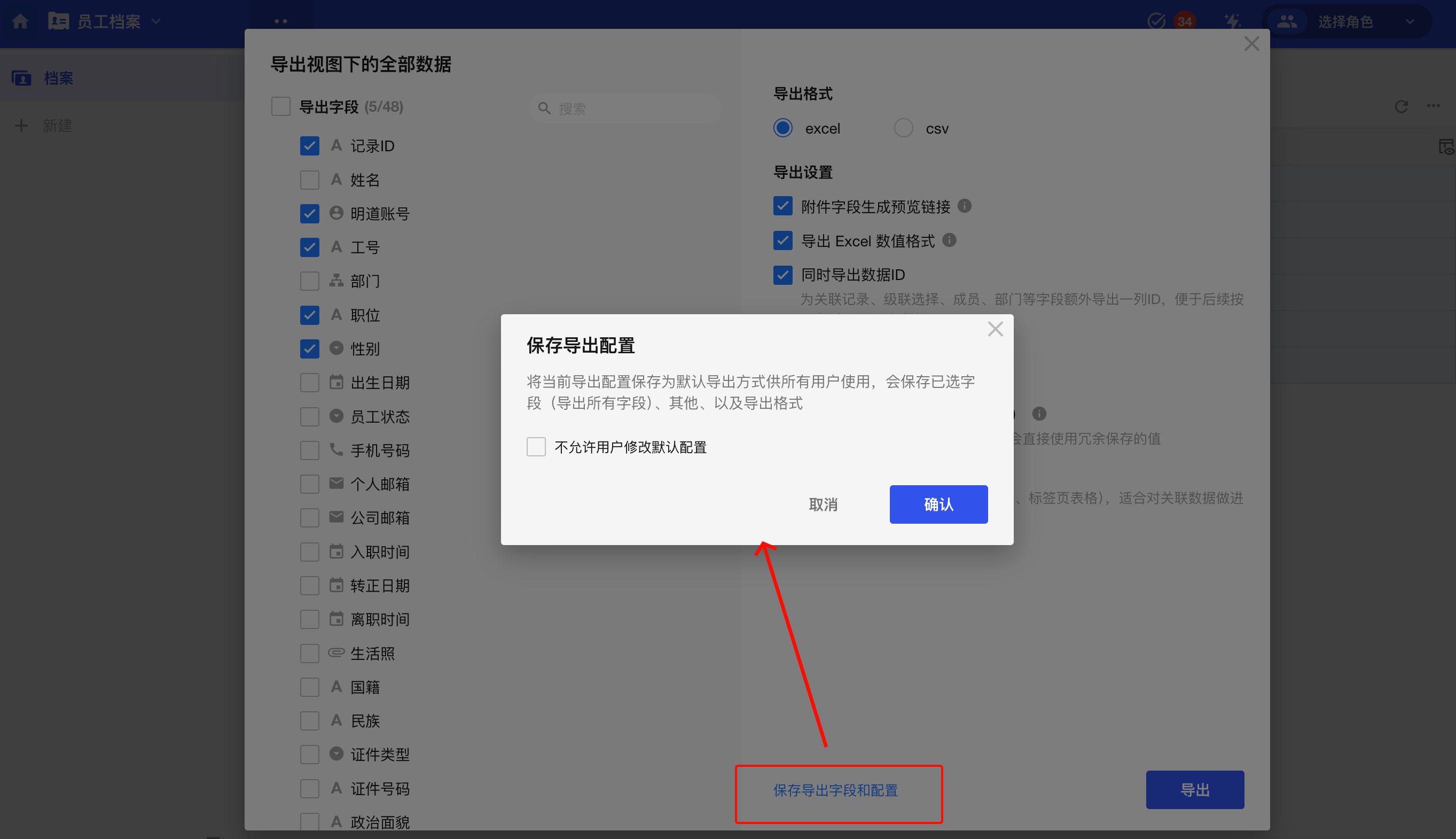 导出时可以选择导出哪些字段,以及其他配置,如关联记录的导出方式、导出文件格式(Excel、CSV)等。