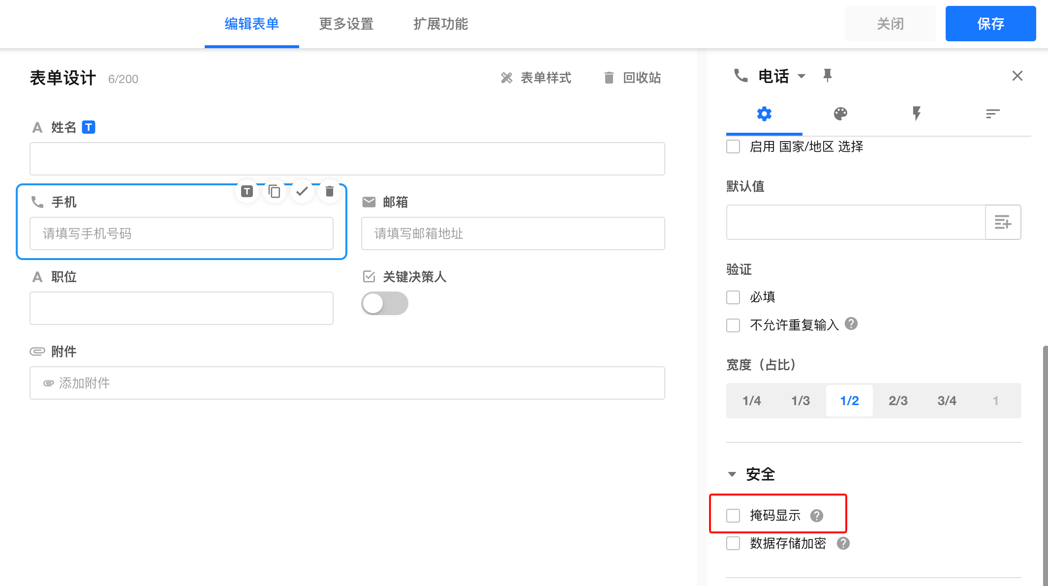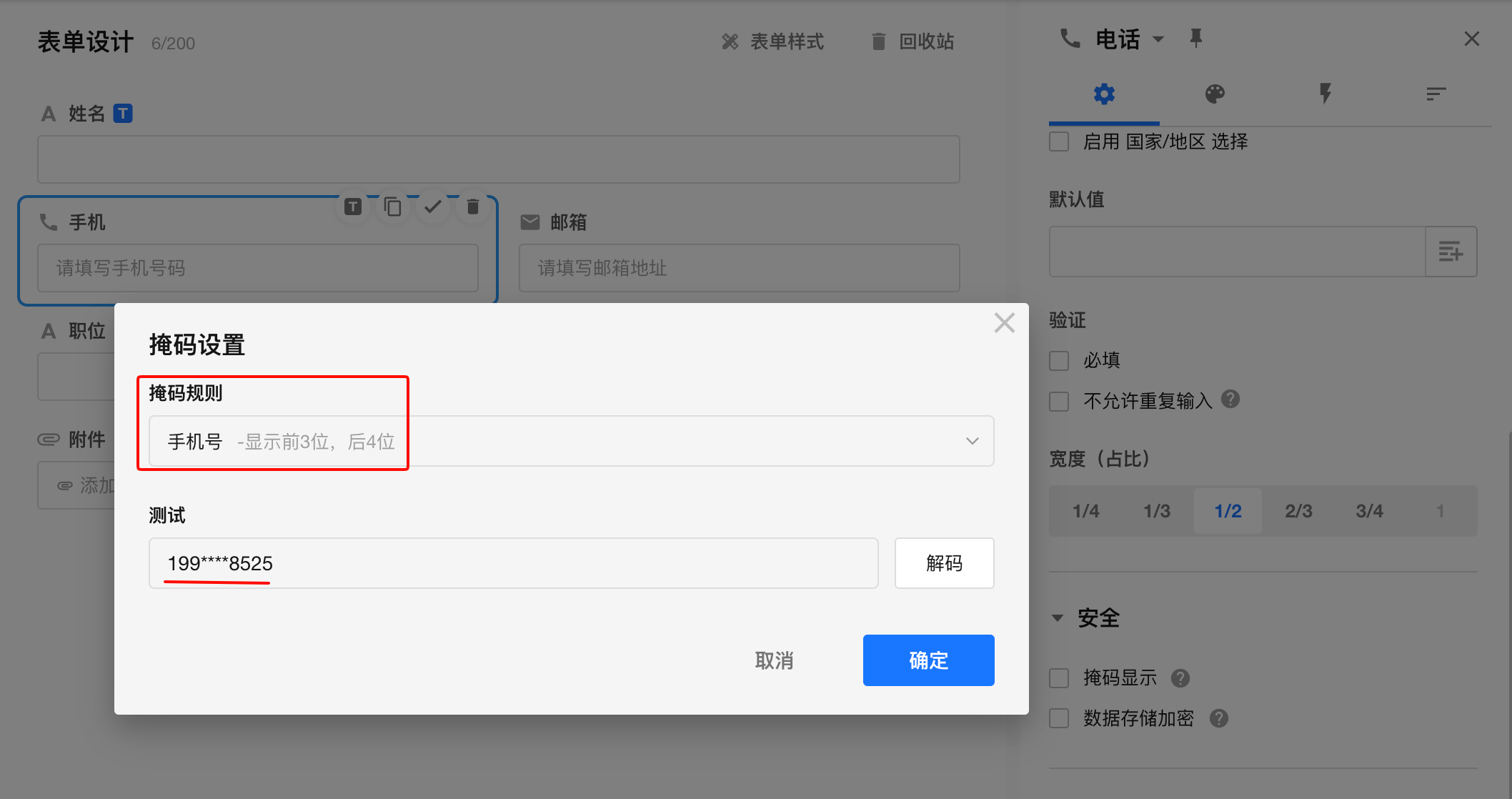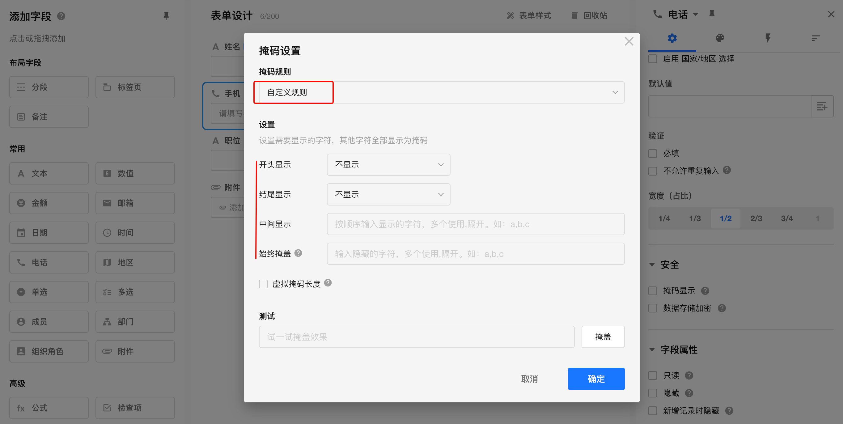 支持掩码显示的字段有: 单行文本、数值、金额、手机/座机、邮箱、证件。