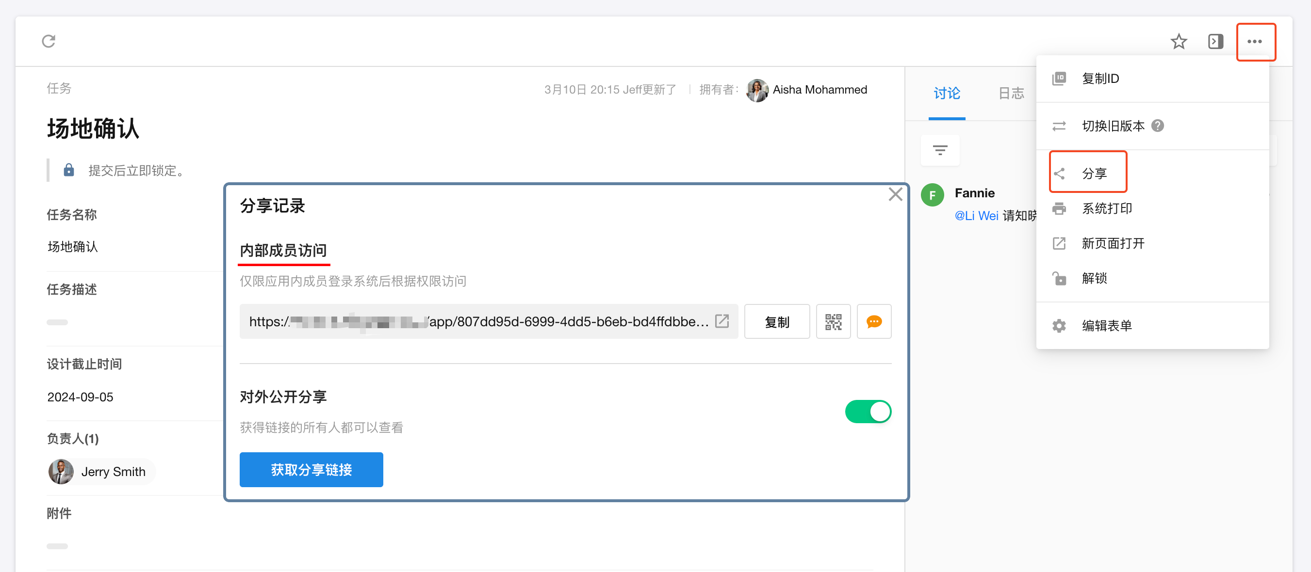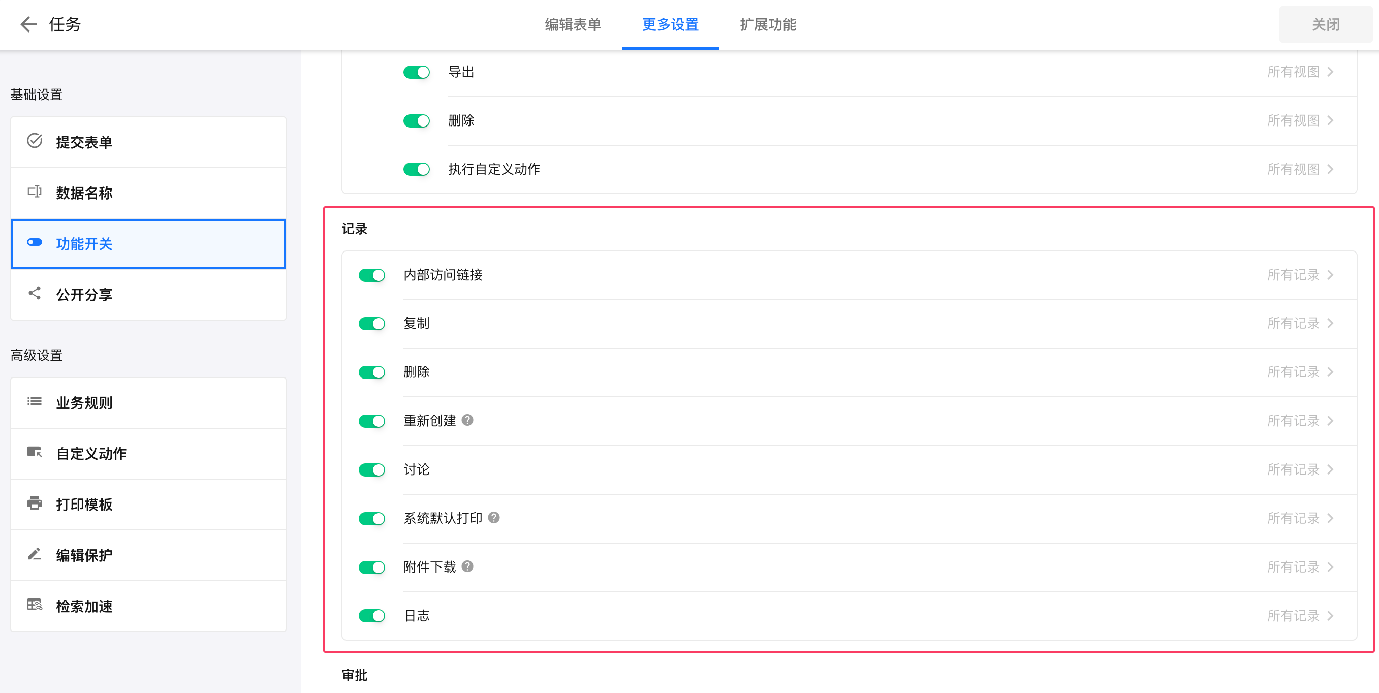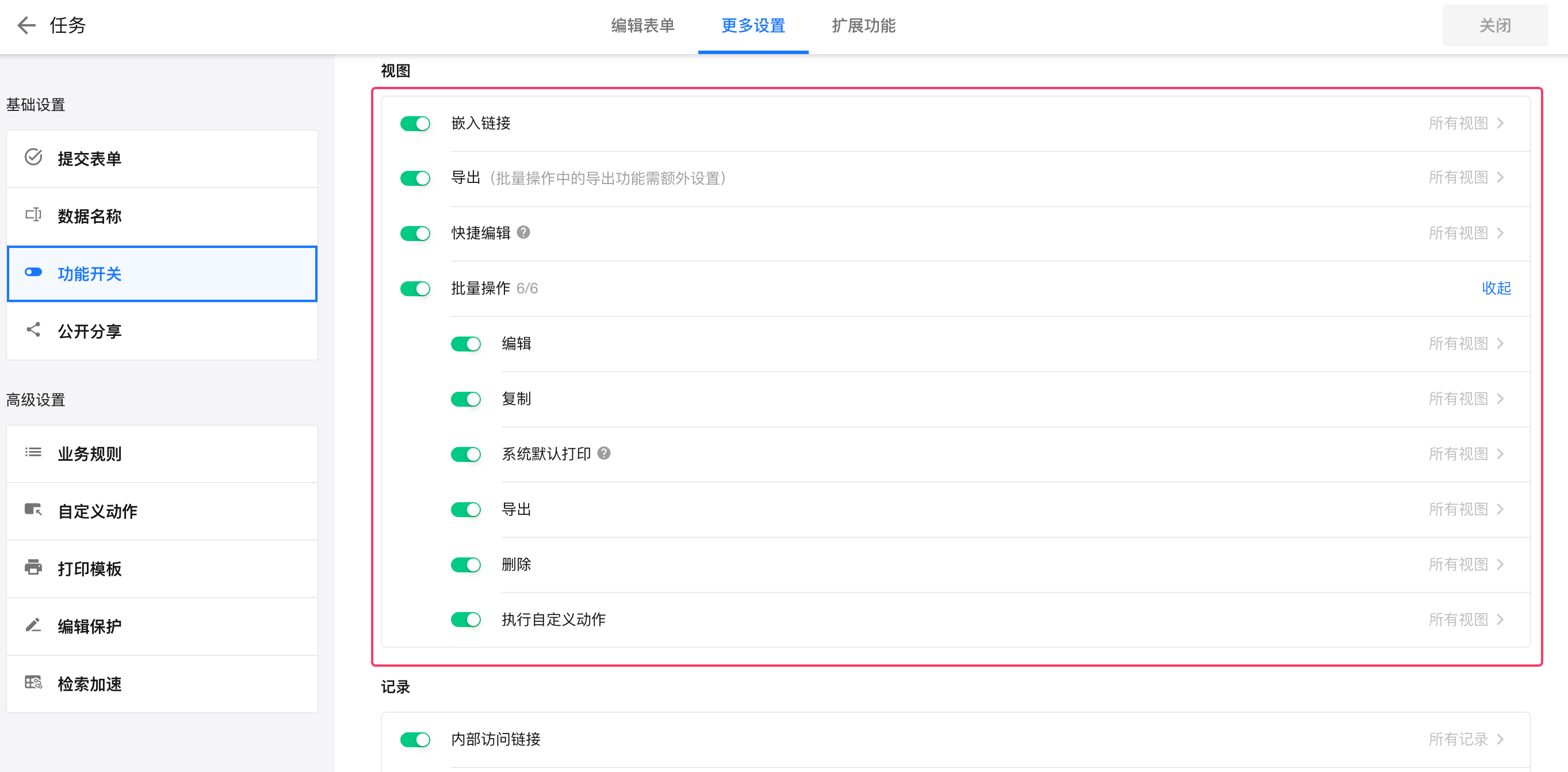 应用搭建工作表功能开关本页总览工作表的功能开关 有些功能需要部分用户才能使用,例如导入数据,可能只有管理员才能导入,普通用户只能逐条录入。有些功能可以仅限制在某个视图下才能使用,例如打印审批完成的记录,只能在“已审批”的视图下才能打印。通过功能开关功能确保了不同角色用户能够按需访问特定功能,既保障了数据的准确性与合规性,又提升了工作效率。 工作表的各项功能开关入口 功能可用性的三种范围设置