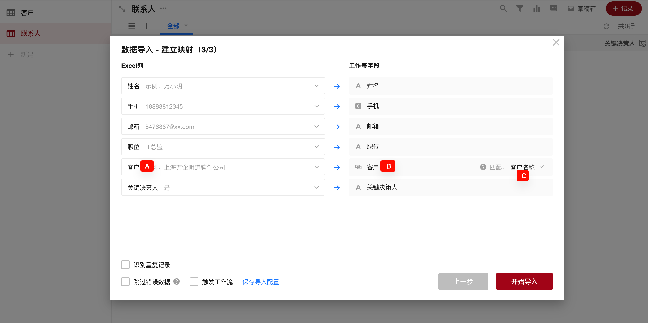 例如,导入联系人时可以自动关联公司的记录,导入公司表数据时,不能自动关联联系人的记录。 因此,如果客户表和联系人表都需要导入数据,请先导入公司表数据,再导入联系人数据,那样才能自动建立关联。