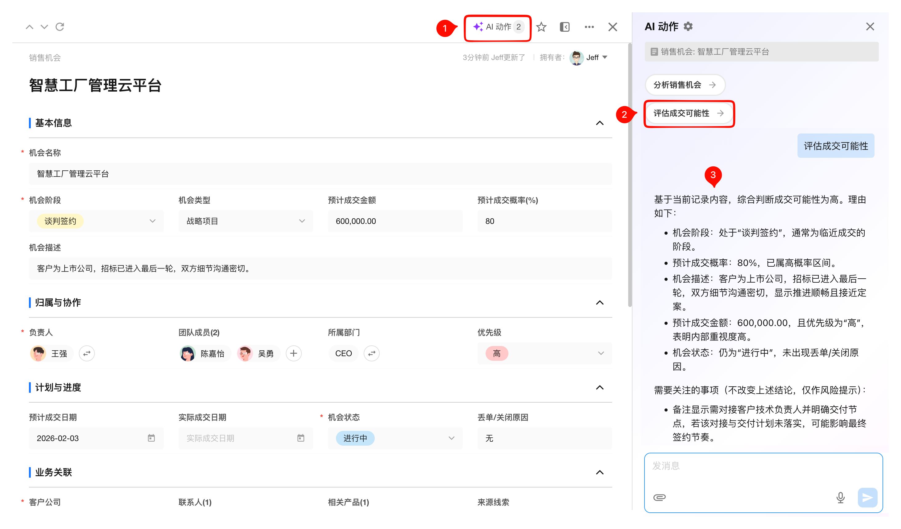 AI 动作是记录详情页进入场景对话的入口。点击任一 AI 动作卡片后,即可开启围绕当前记录的多轮对话。系统自动注入记录字段、讨论、日志等上下文,并按卡片配置的提示词、模型与工具持续输出结果。