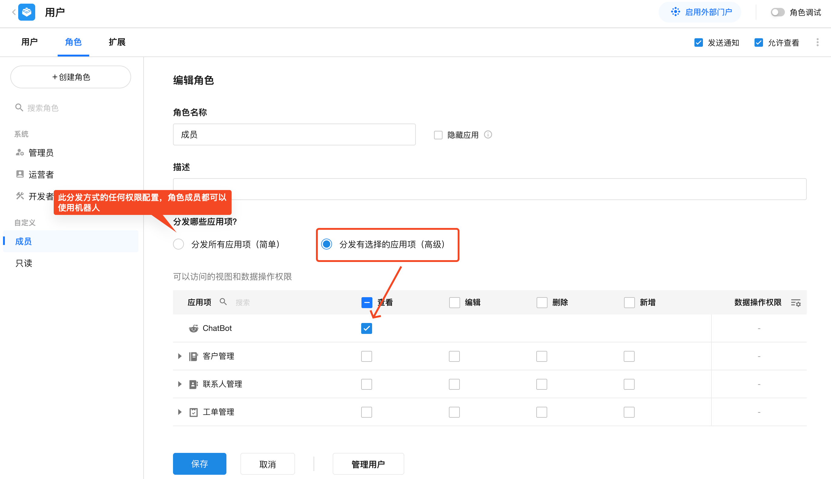 | 分发有选择的应用项(高级) | ◦ 赋予「查看」权限 → 可使用对话机器人 ◦ 未赋予「查看」权限 → 无法使用 |