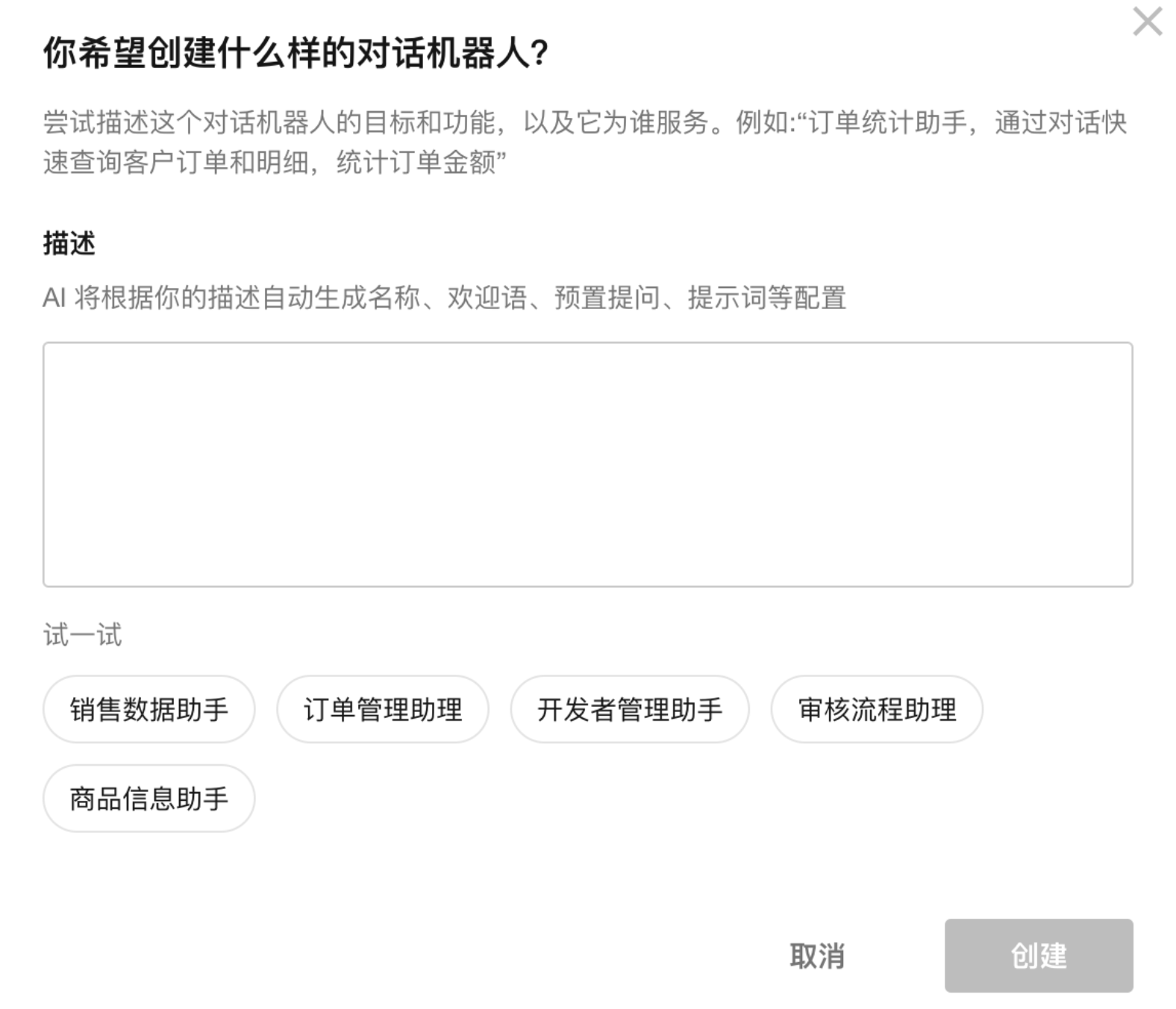 系统会自动根据应用信息生成若干描述,展示在“试一试”区域。选择后,描述内容会自动填入输入框,系统据此生成机器人配置。