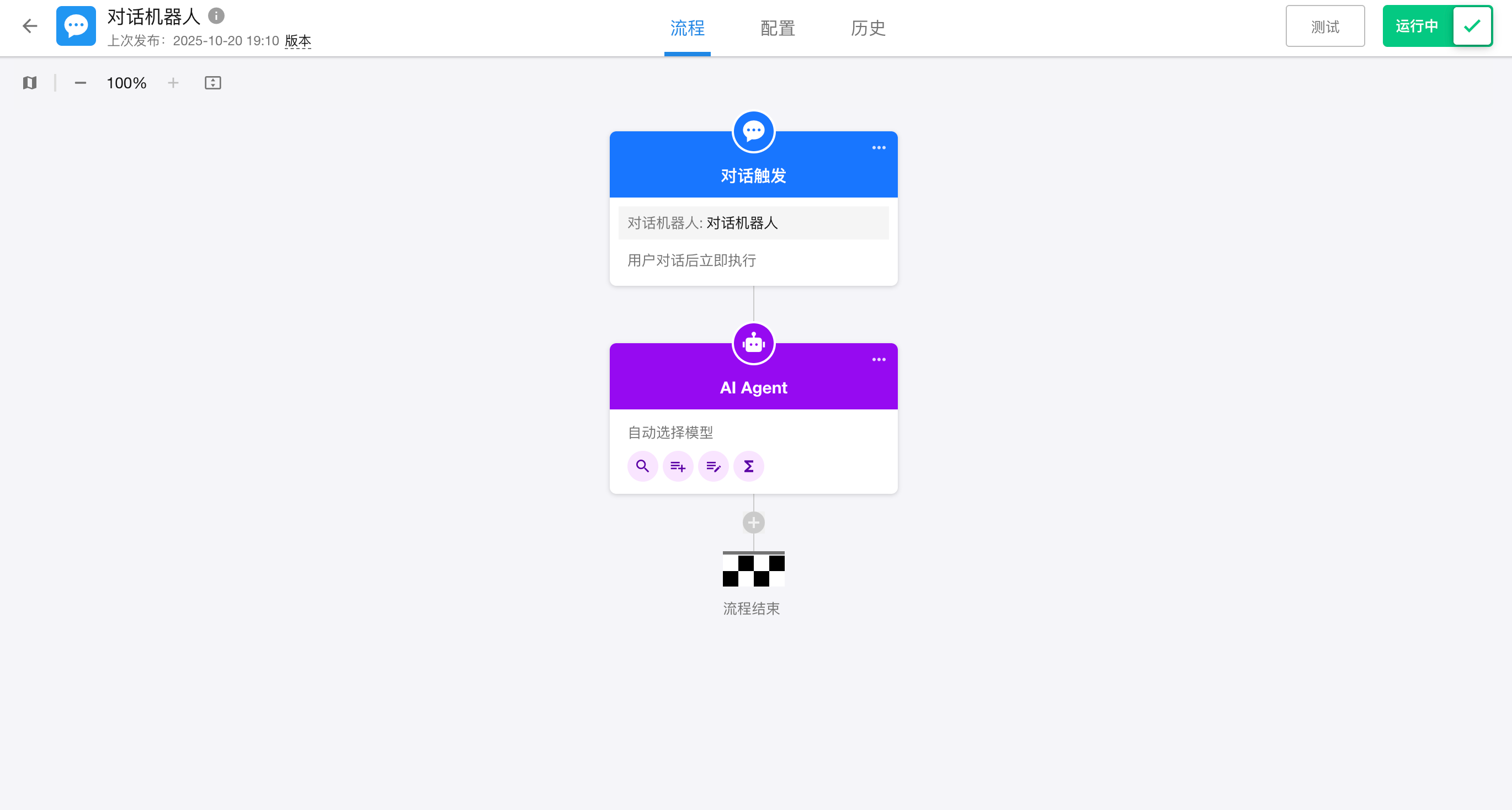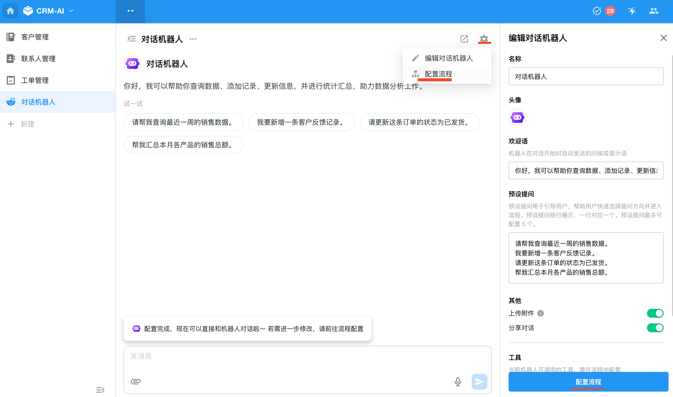 点击“配置流程”按钮,开始配置对话工作流。 后续修改流程,可点击对话窗口右上角的“设置”按钮 ,然后点击"配置流程" 进入流程配置页面。