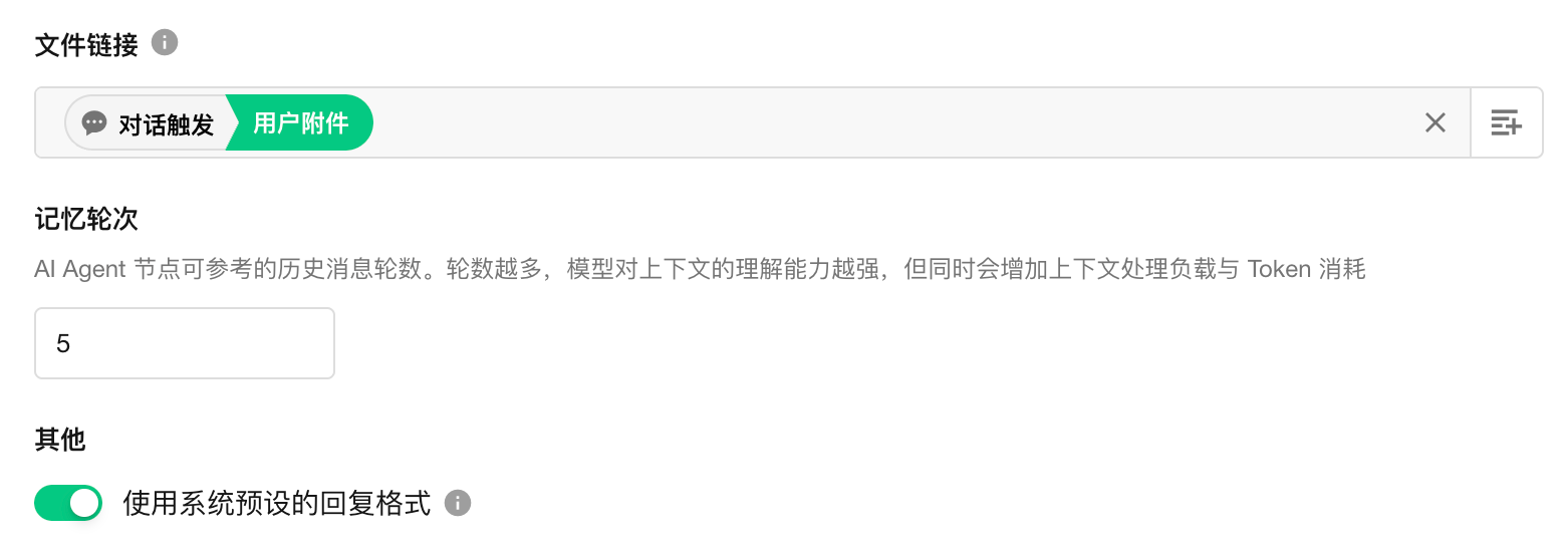 开启"使用系统预设的回复格式"后 ,Agent 按系统预设的语气、格式、结构回复;关闭后可在提示词中约束回复格式。