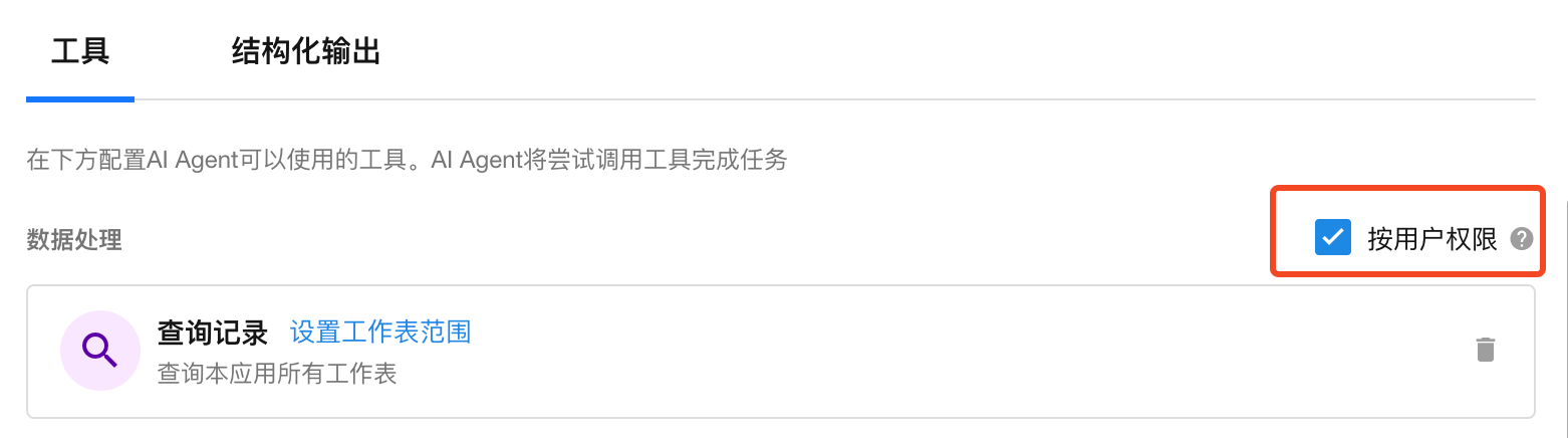 - 勾选"用户权限控制"时,工具执行时会依据对话者的用户数据权限进行鉴权;不勾选后,忽略用户权限,可访问全部数据