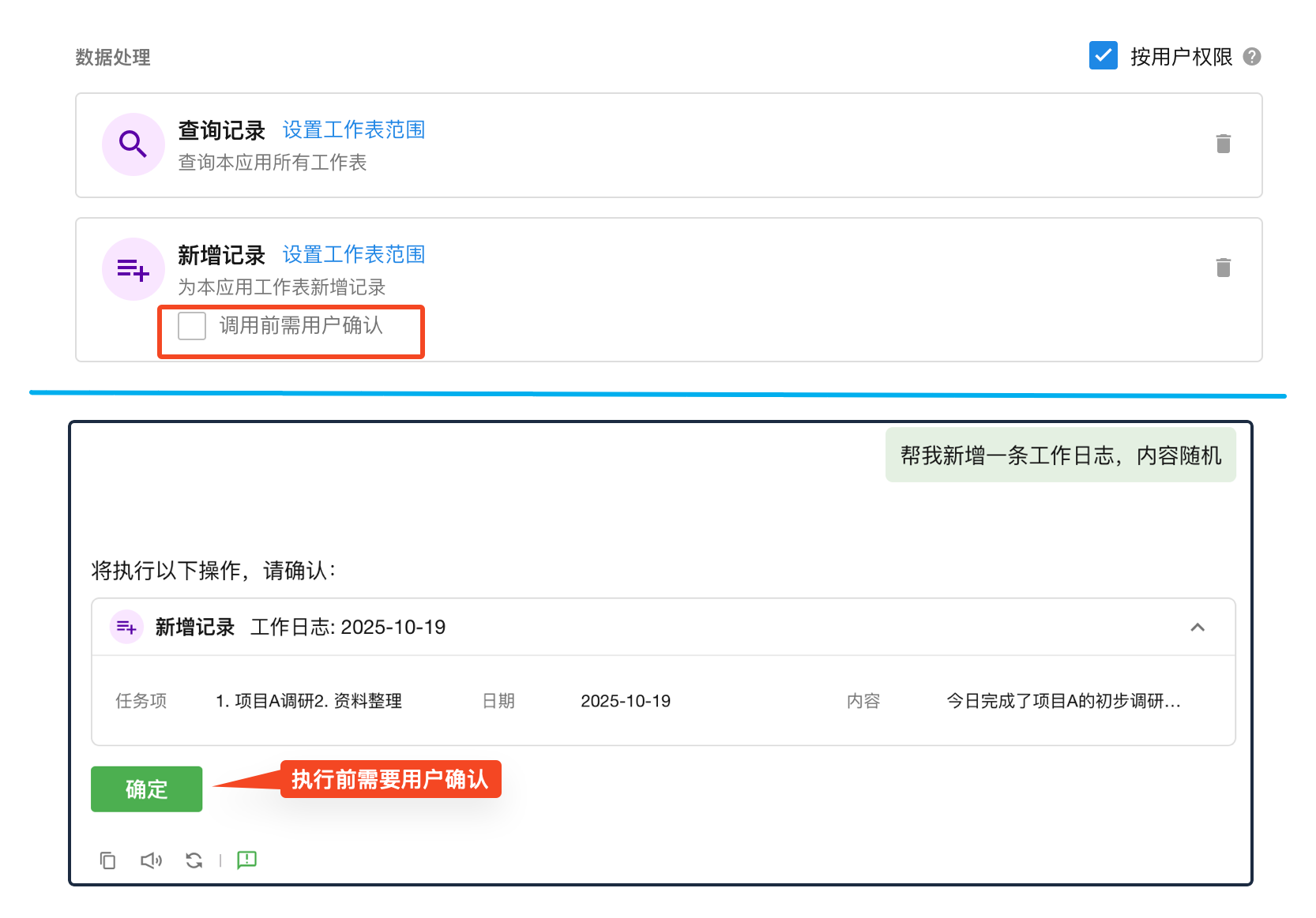 开启后,机器人在执行工具操作前,会在对话中向用户发起确认,仅在用户同意后继续执行。