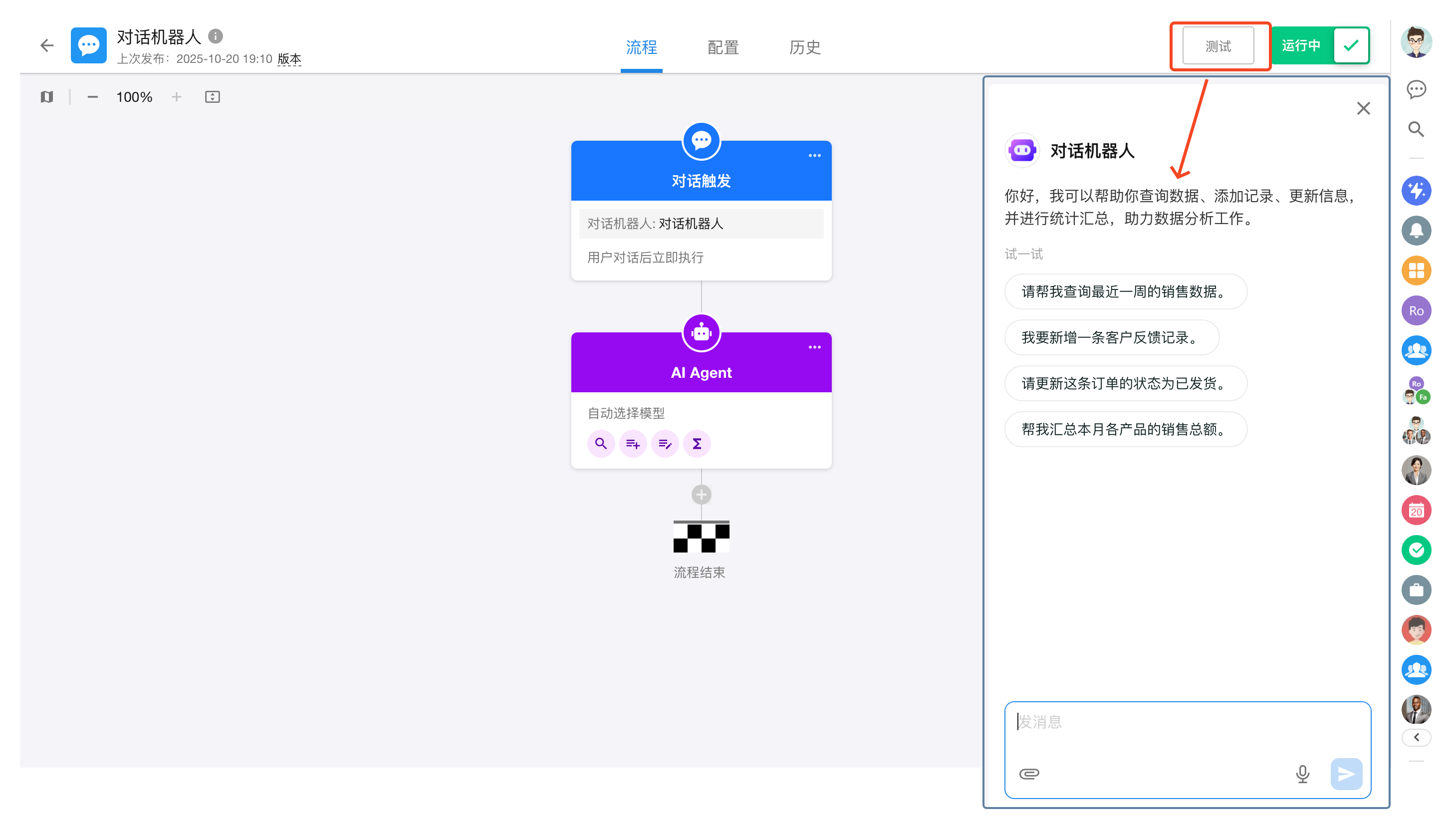 点击工作流编辑器右上角「测试」按钮可打开测试对话窗口。