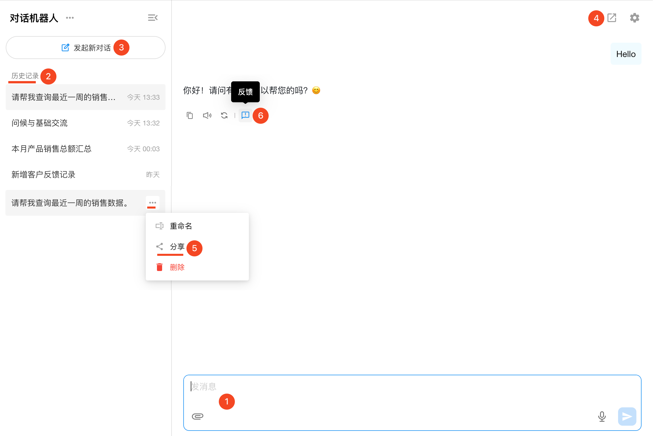 | 历史记录 | • 左侧显示近 30 天的个人历史会话; • 可在任意历史会话中继续对话; • 历史记录中仅可查看本人数据。 • 可删除历史对话 |
