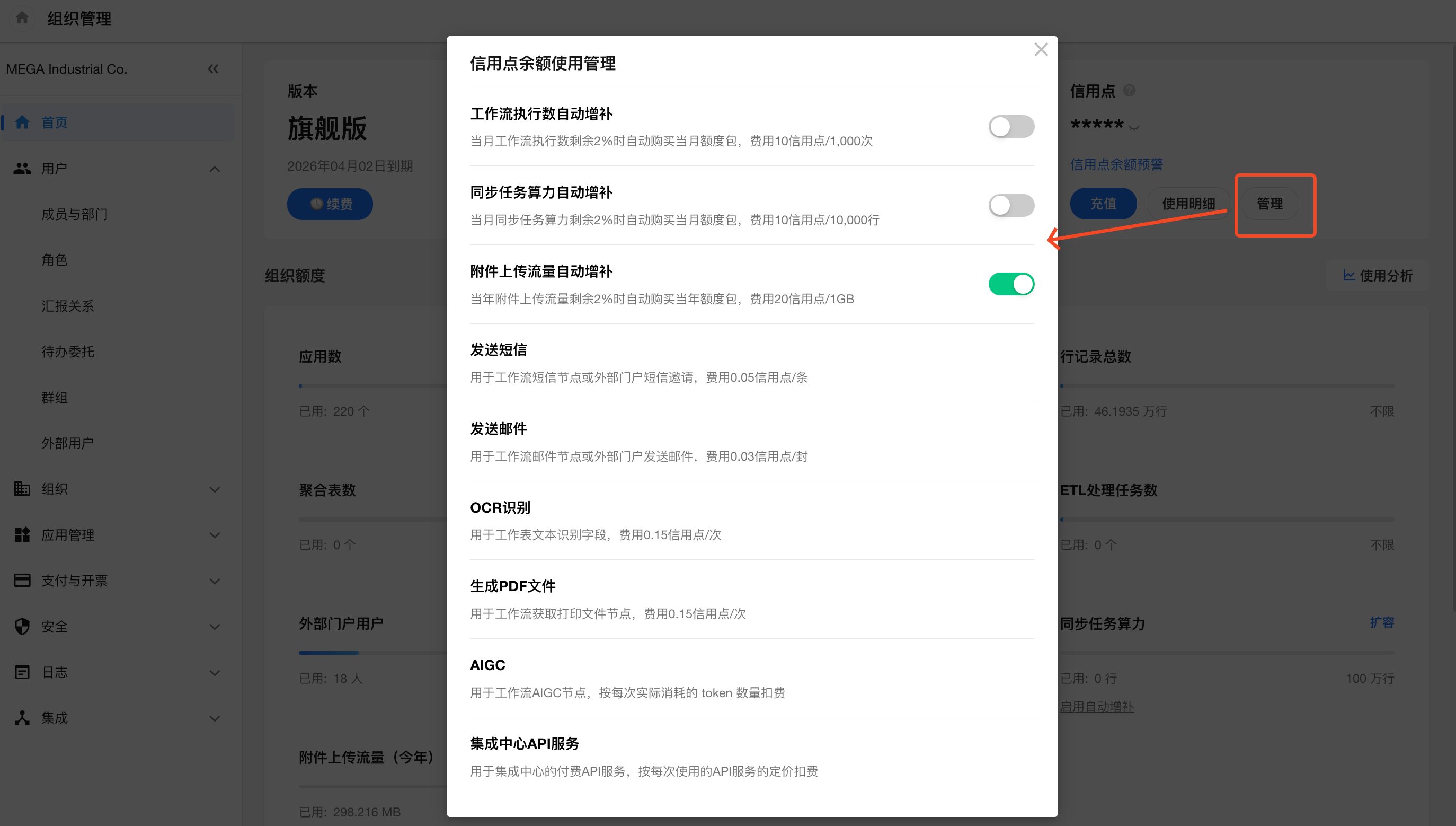 可自动增补的项有:工作流执行数、同步任务算力和附件上传流量