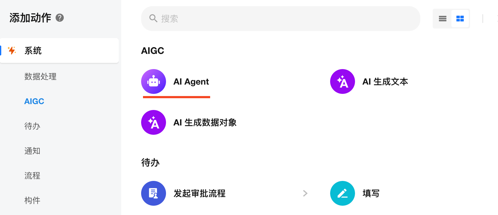 在工作流编辑器中, 点击「+」新增节点,选择「AI Agent」即可进入配置页面。