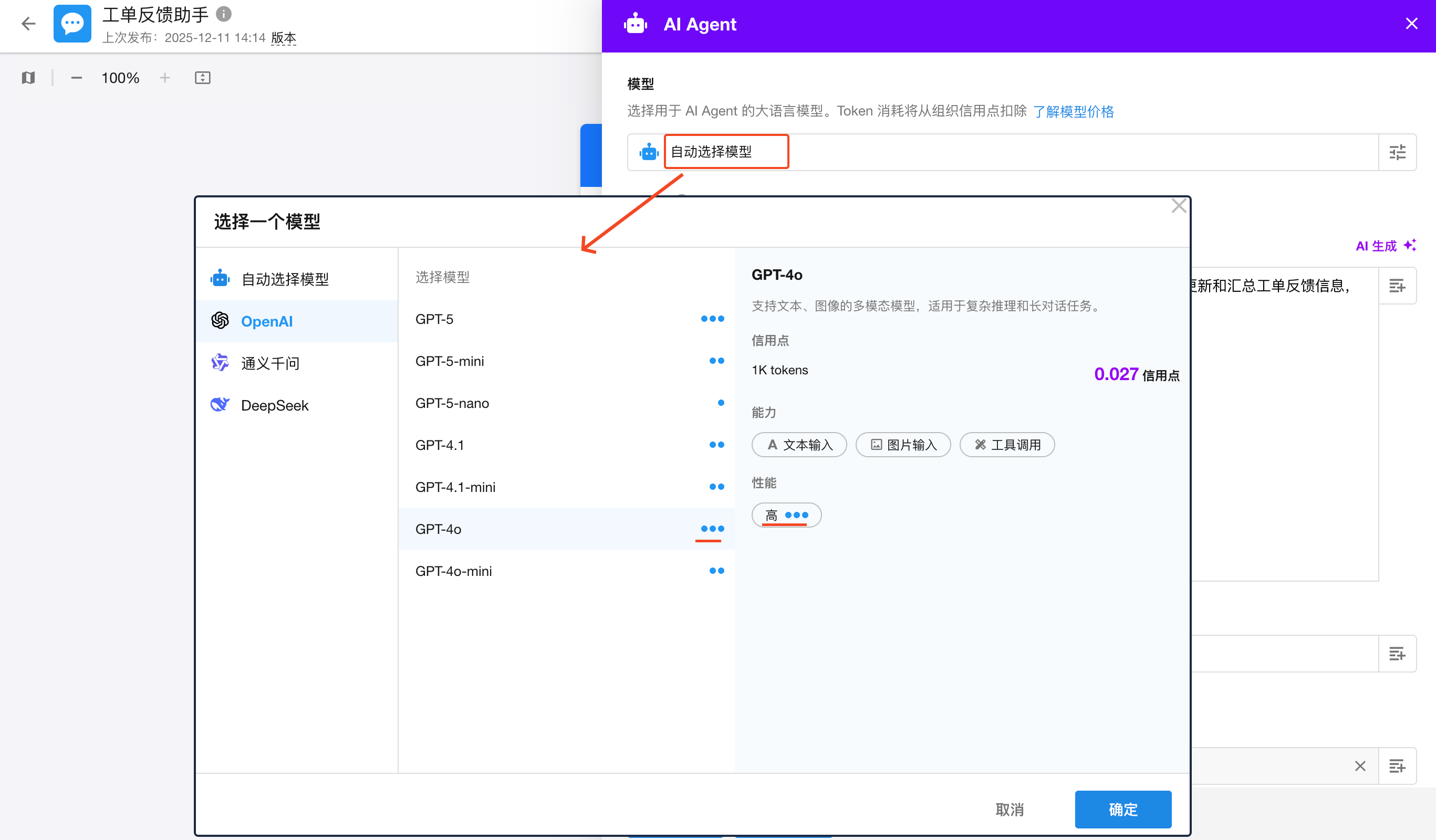 Agent对大语言模型的消耗将根据不同模型的Token定价扣减信用点。请保证组织信用点充足。