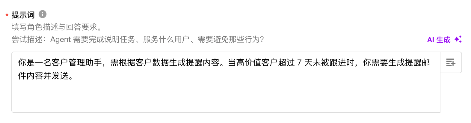【示例演示:系统检测到客户超时未跟进 > AI Agent 自动生成提醒文案 > 邮件发送负责人】