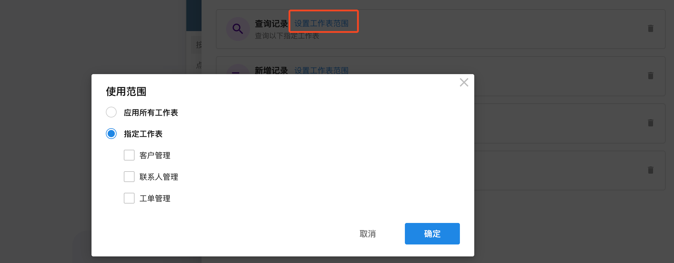 当所选工具为「数据处理工具」类型时,可进一步指定可调用的工作表范围。
