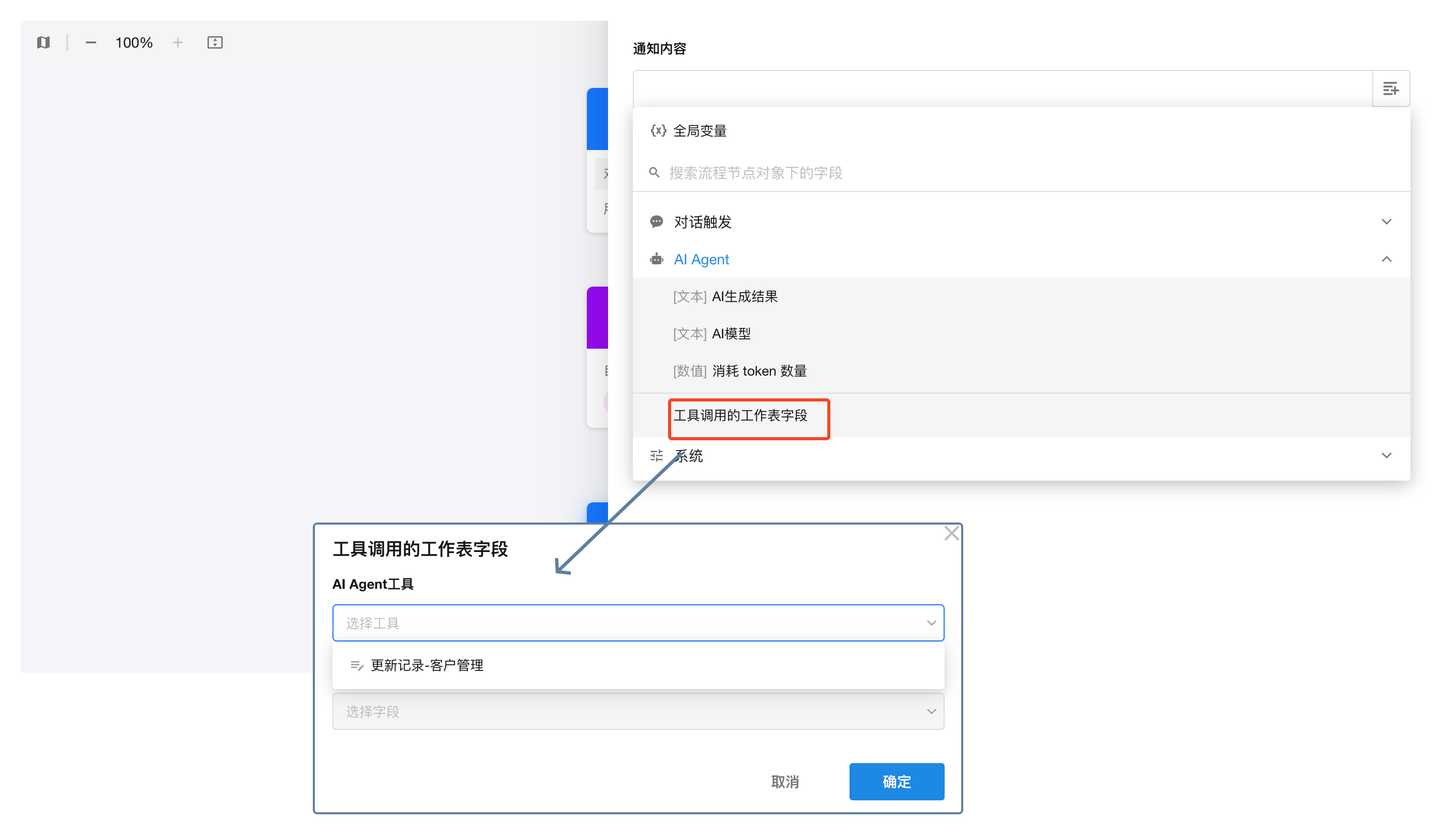 当 AI Agent 调用了「查询记录」「新增记录」「更新记录」等工具,且设置了工作表范围,后续节点可引用处理记录的字段值。