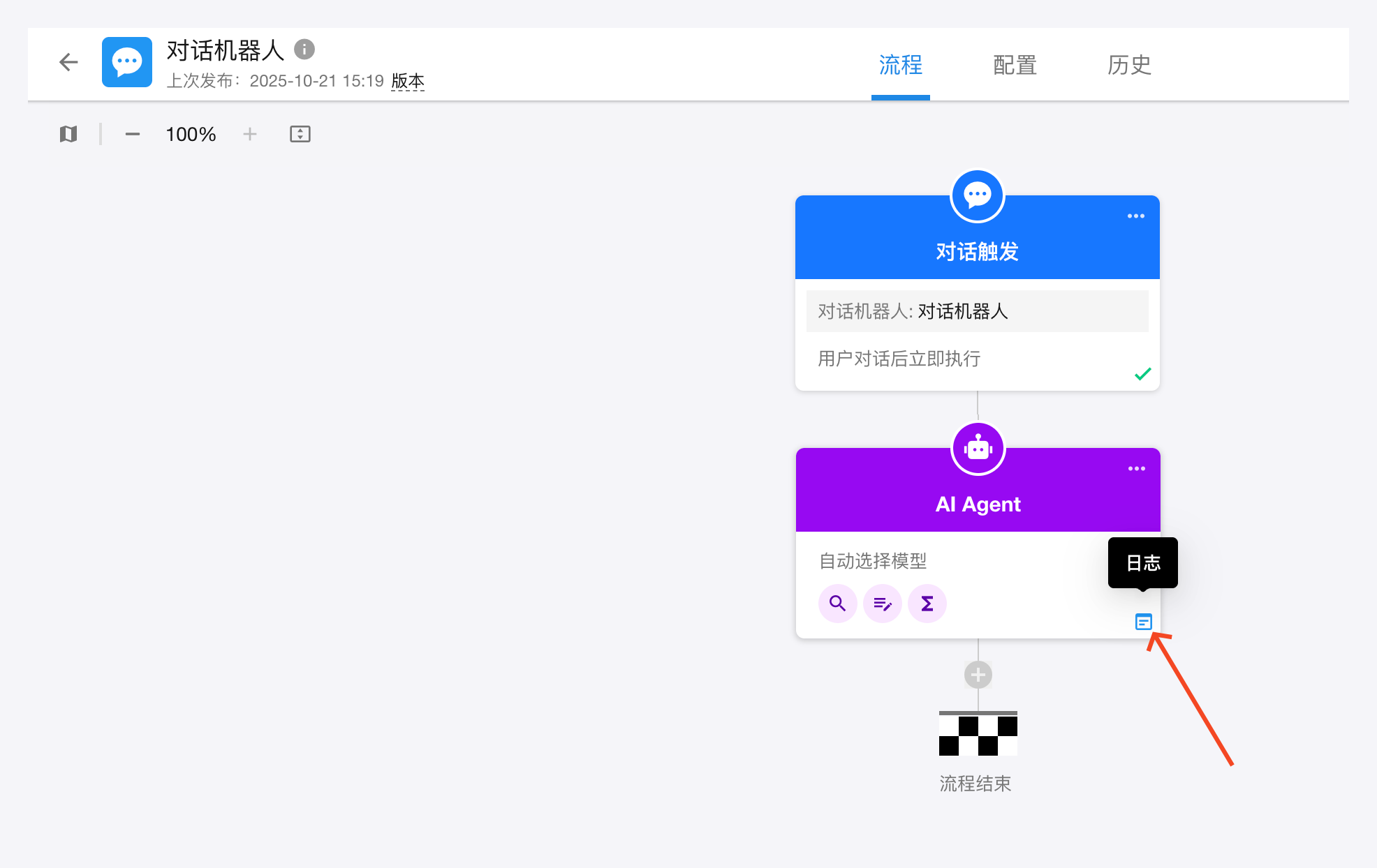 AI Agent 节点在每次执行后,都会自动生成一份执行日志,用于查看模型调用过程与输出结果。