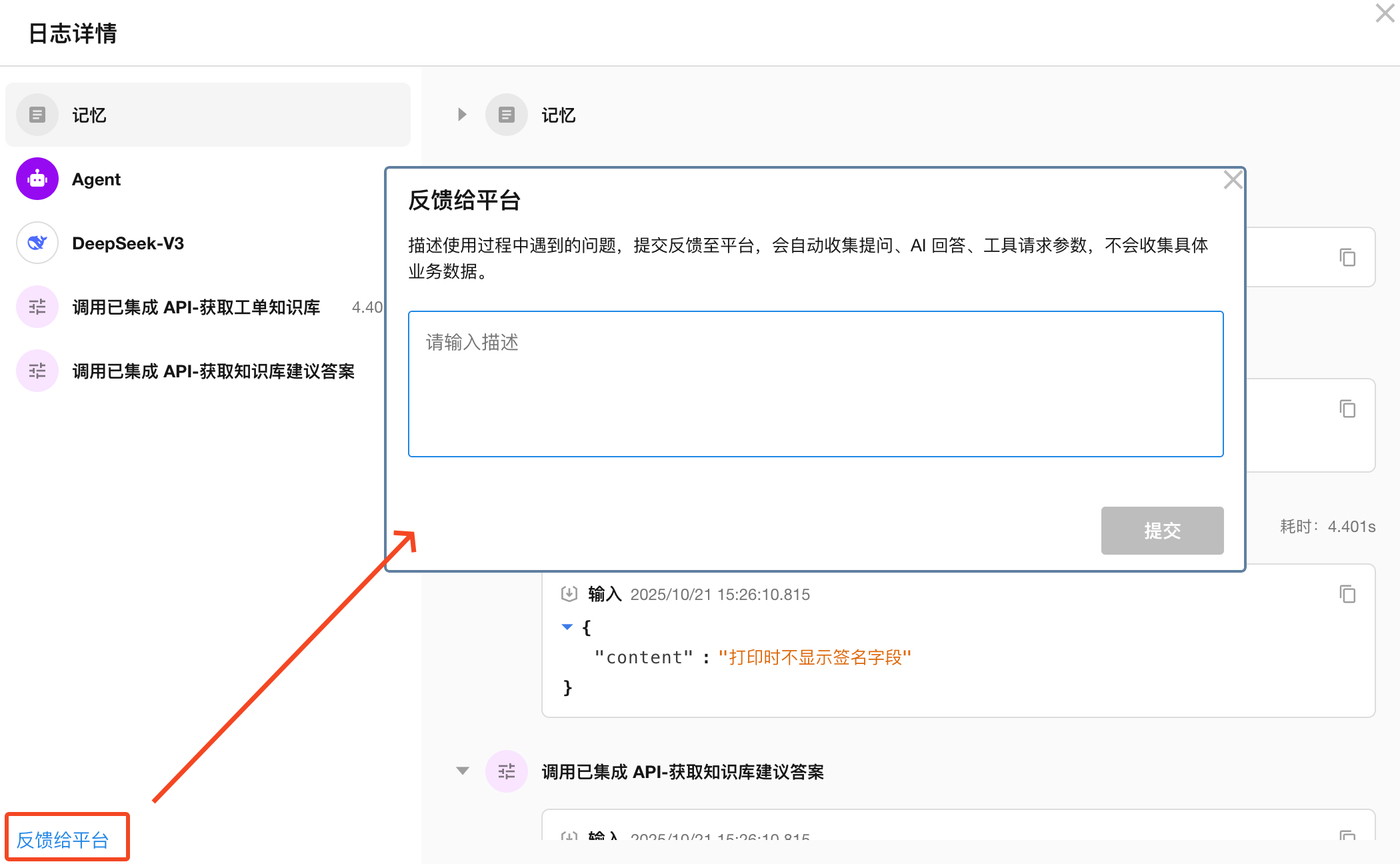 若对 AI Agent 执行过程有疑问,可点击日志页左下角 “反馈给平台” 按钮,将问题提交至 HAP 官方。