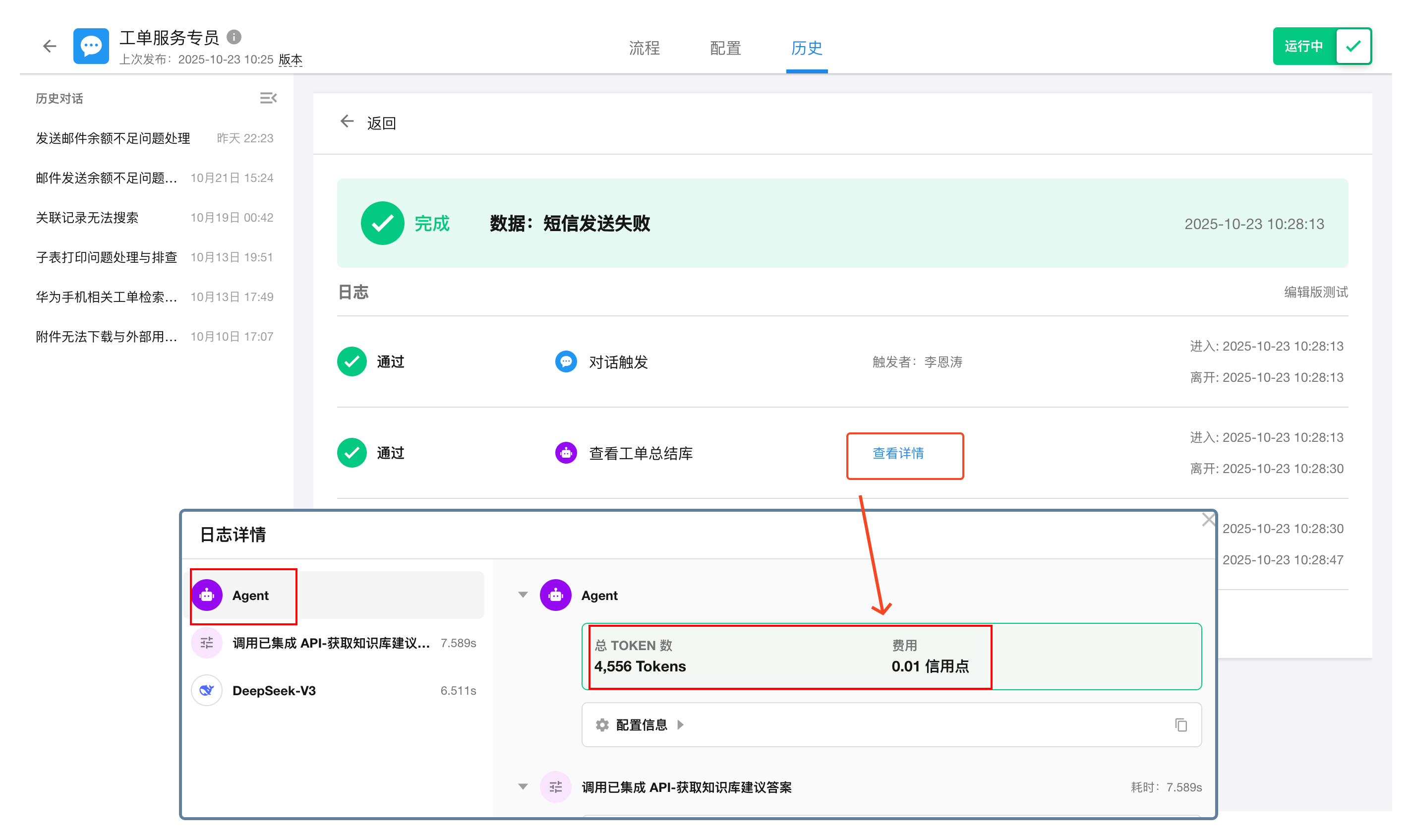 在Agent 执行日志中,可查看每个Agent节点的Token消耗费用。