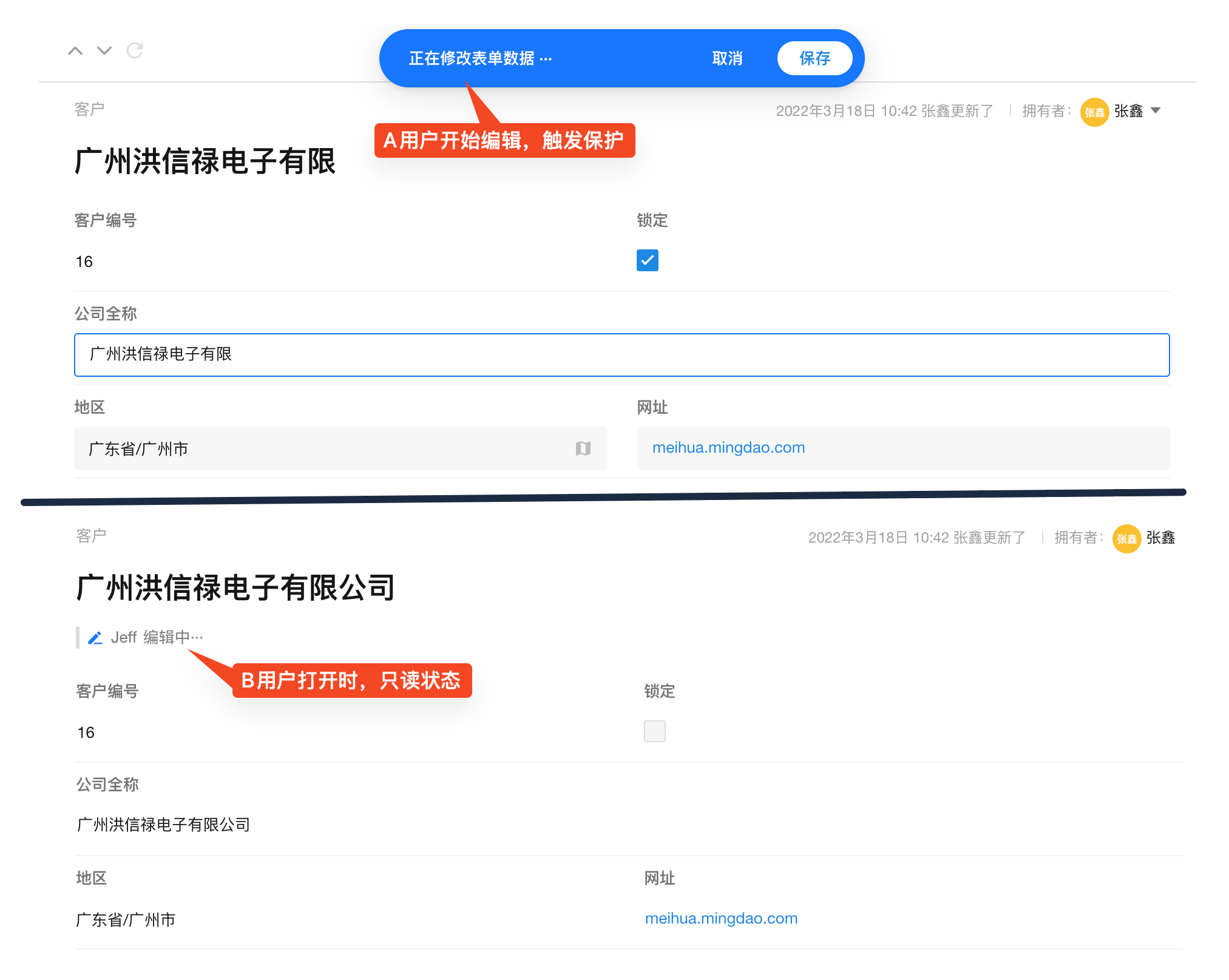 工作表中开启"编辑保护"后,当某个用户在记录详情页触发编辑时,该记录便进入保护状态,仅当前用户可以编辑,对其他人只读。