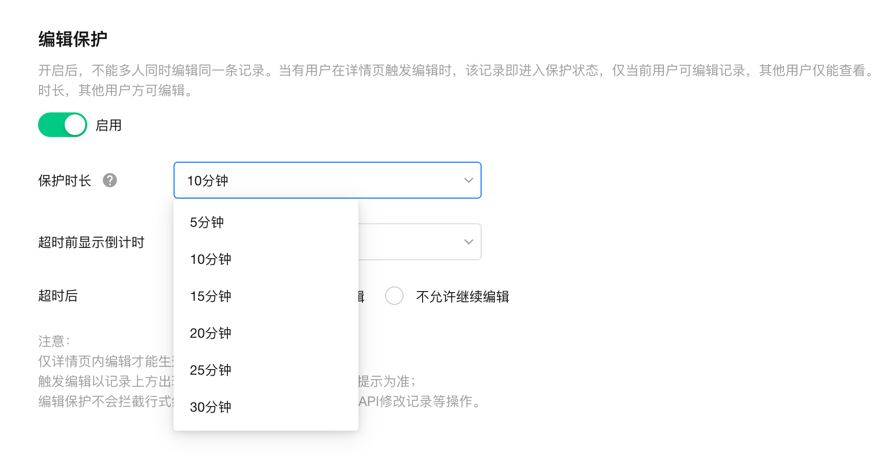 保护时长是指在编辑保护模式下,可以设置多长时间无操作后,自动退出保护状态,其他用户可以编辑记录。 保护时长最短5分钟、最长30分钟。