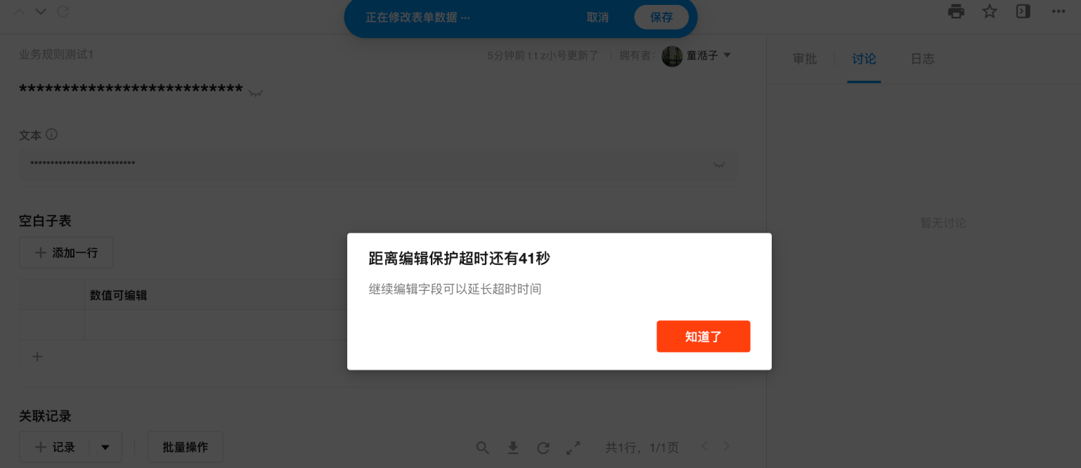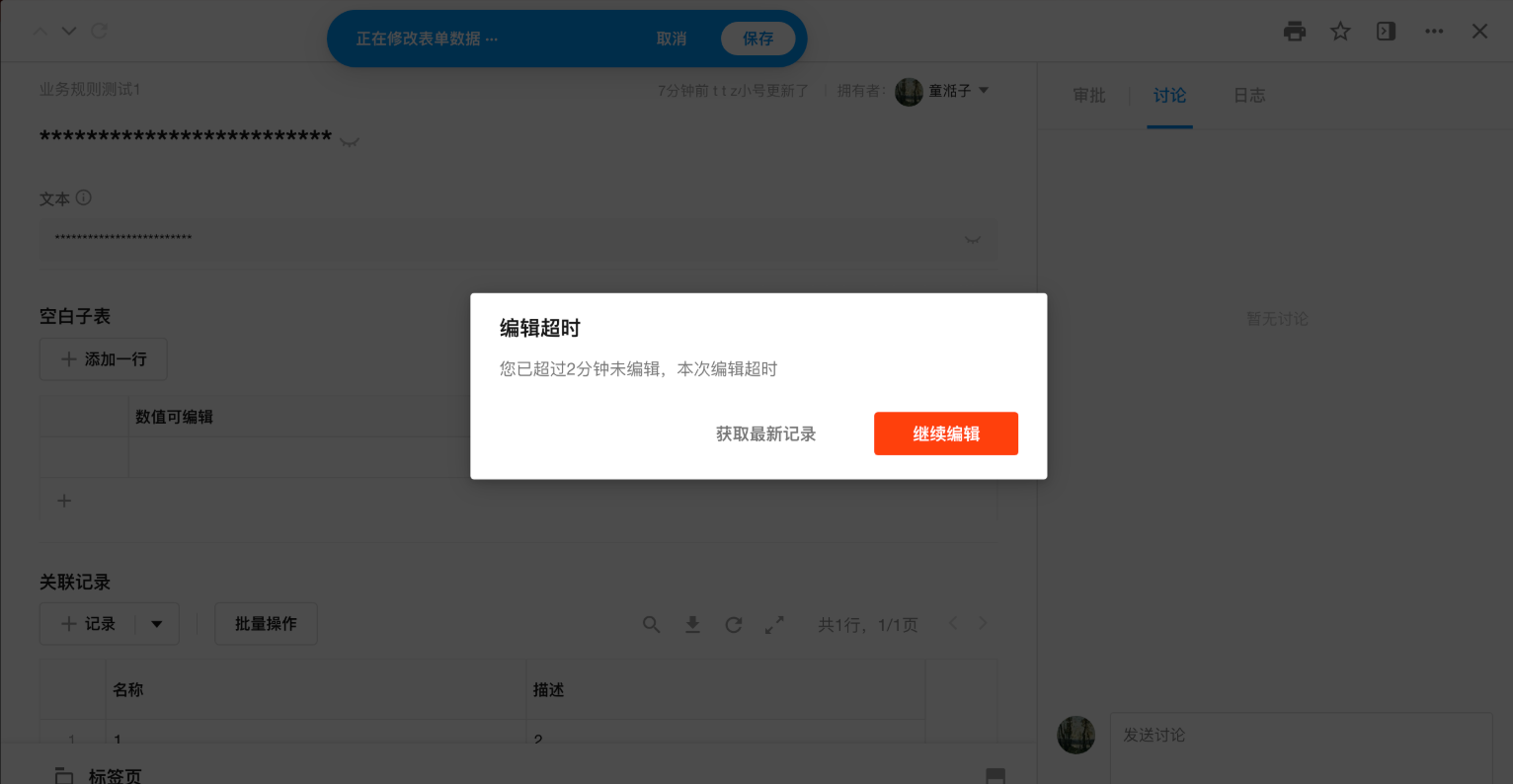 若选择【记录未变更时可以继续编辑】,会校验是否有其他人正在编辑或记录是否已经被更新。只有记录未被更新且无他人正在编辑,当前用户才可继续编辑。