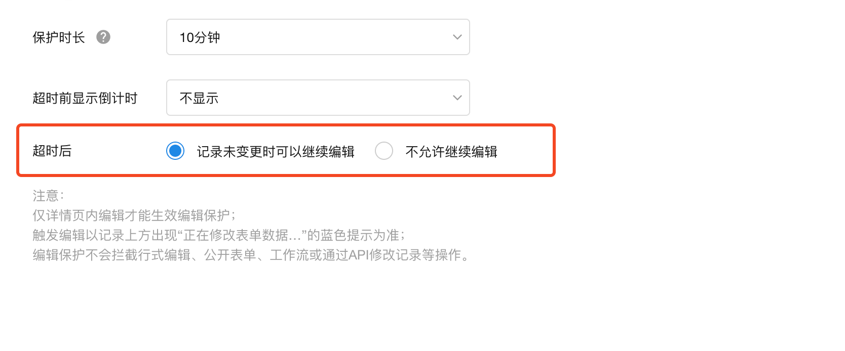 则无论记录是否被变更,超时之后都无法继续编辑。